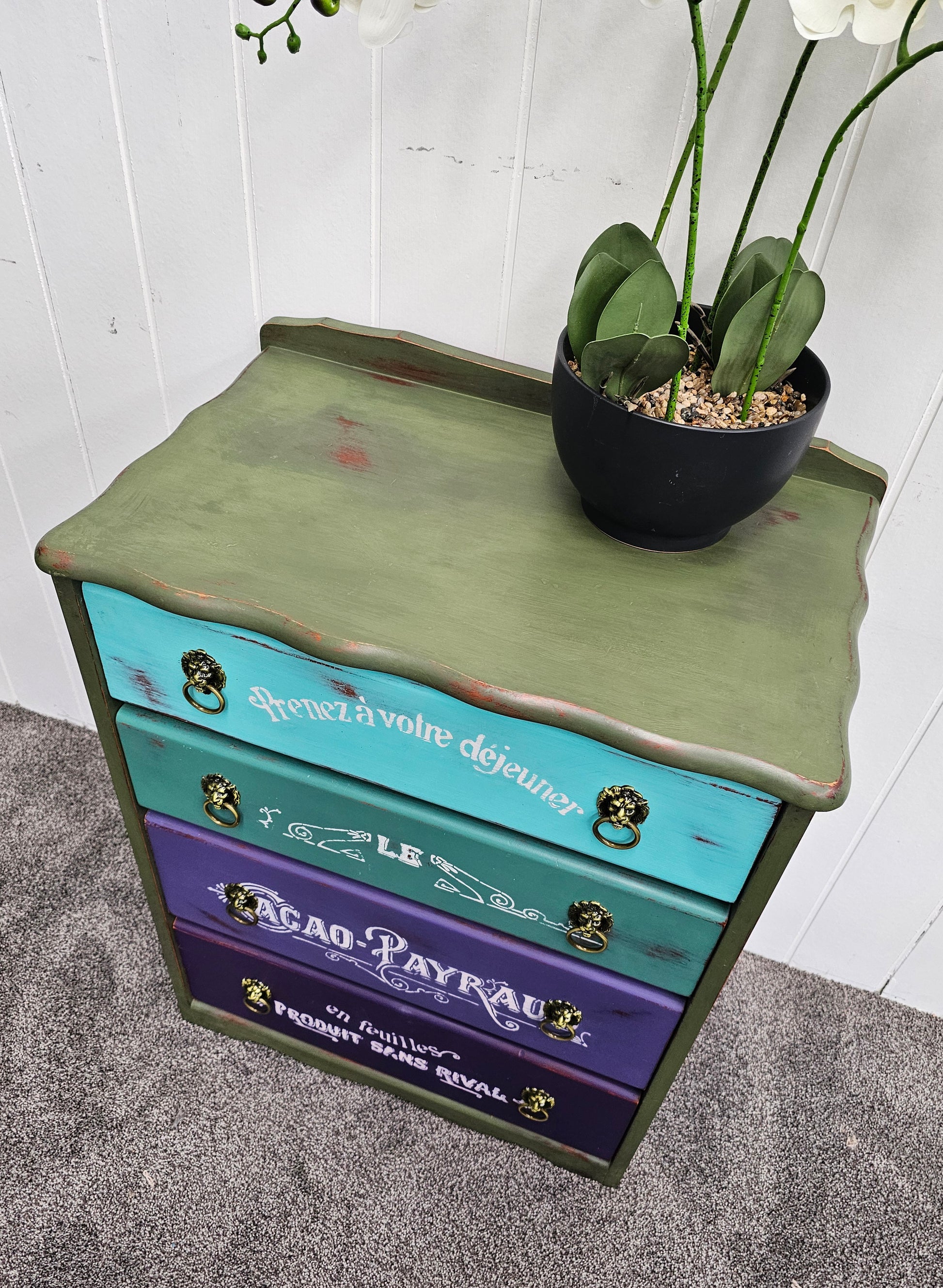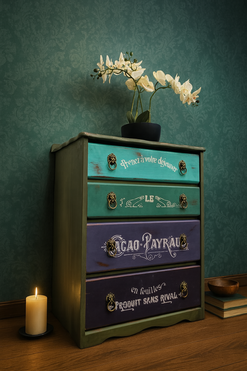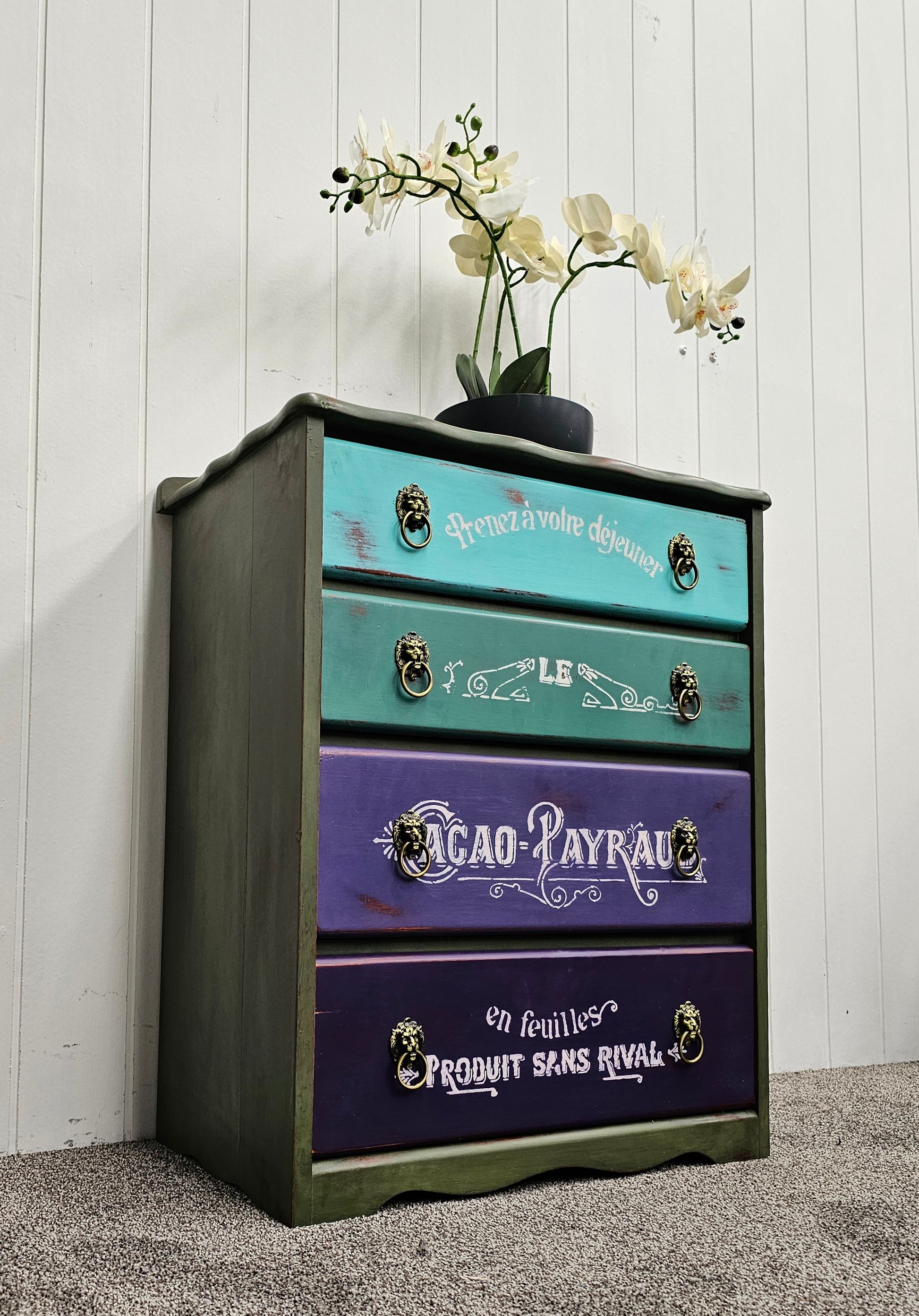Bring a playful pop of color and vintage French charm into your space with Bonbon Bureau, a whimsically reimagined chest of drawers that’s equal parts art and function. With its cascading drawer colors—from minty turquoise to royal plum—and ornate white typography inspired by vintage French adverts, this piece tells a sweet story in every shade.
