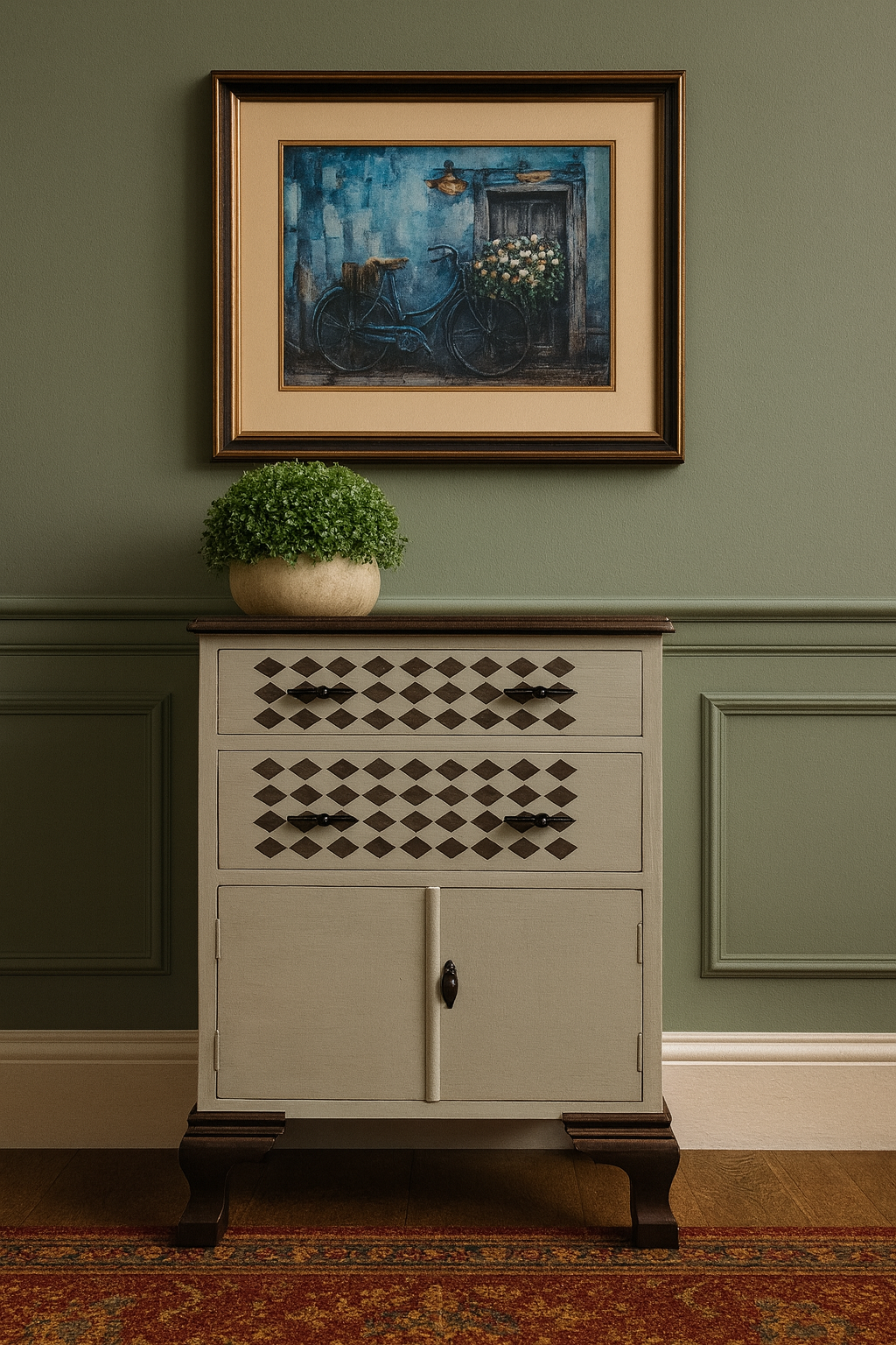 With its elegant stance and bold diamond detailing, Imperial Hideaway brings a theatrical charm wrapped in refined calm. Soft linen meets deep espresso accents, while the stencilled pattern adds a playful yet sophisticated rhythm. A perfect marriage of drama and restraint.