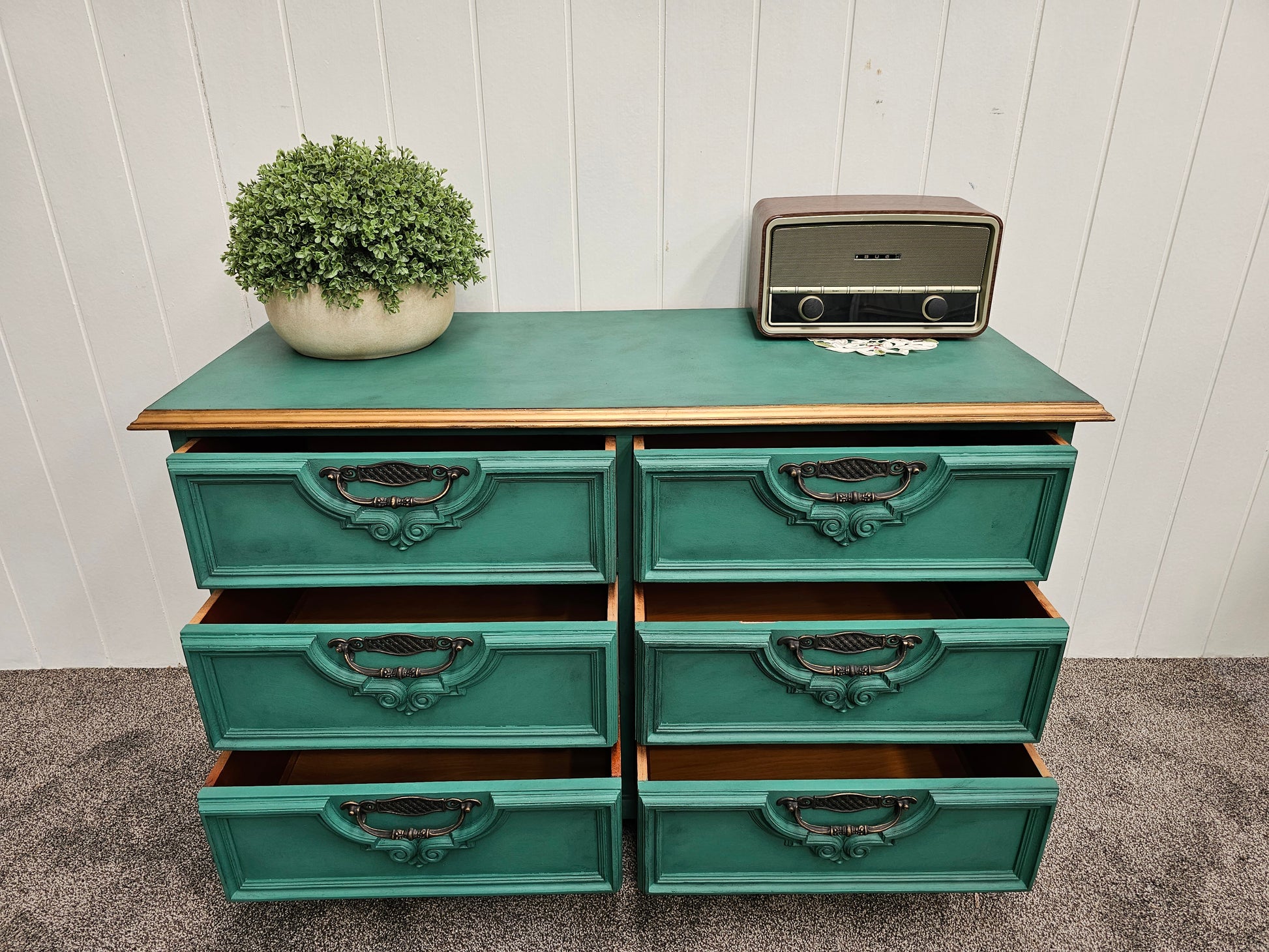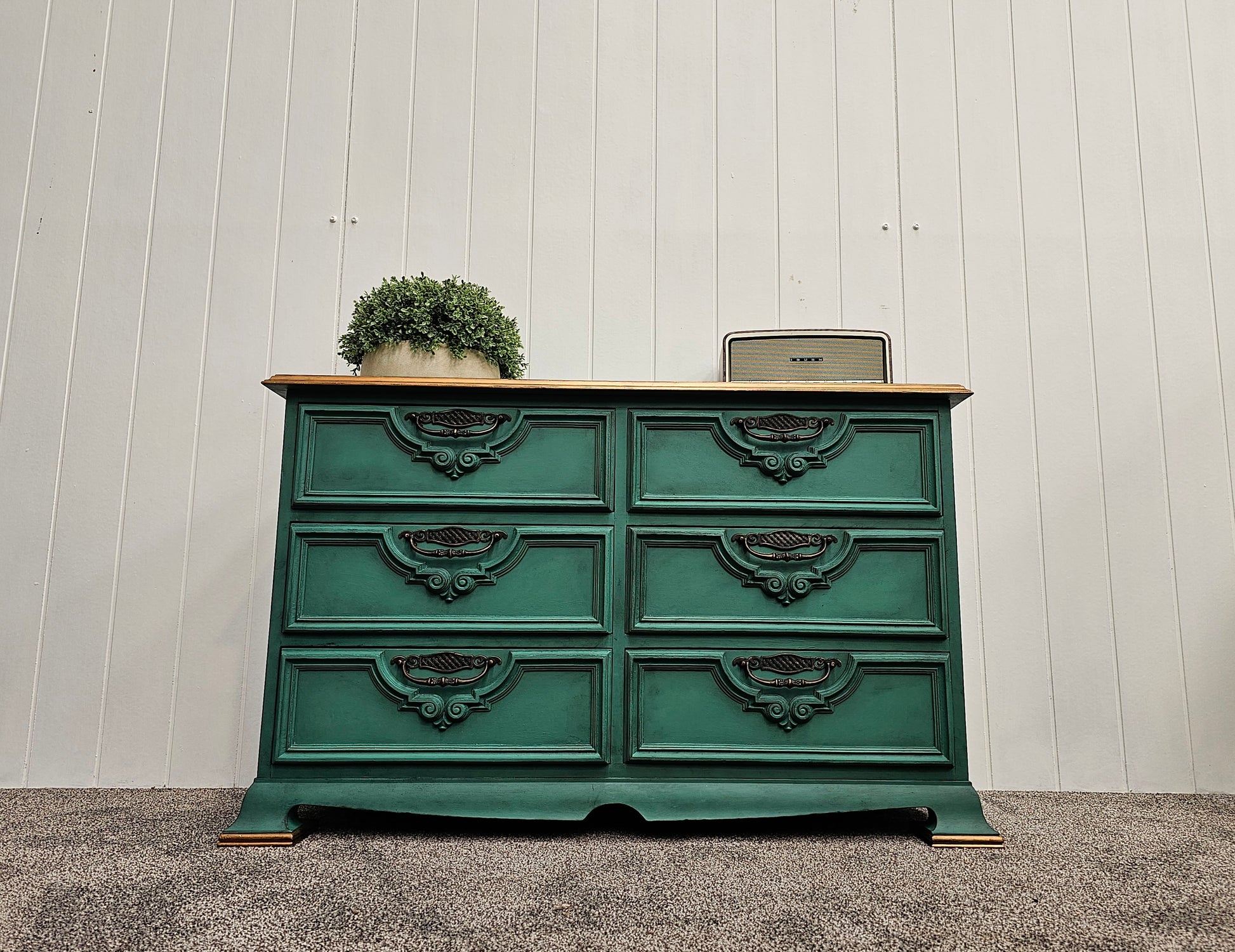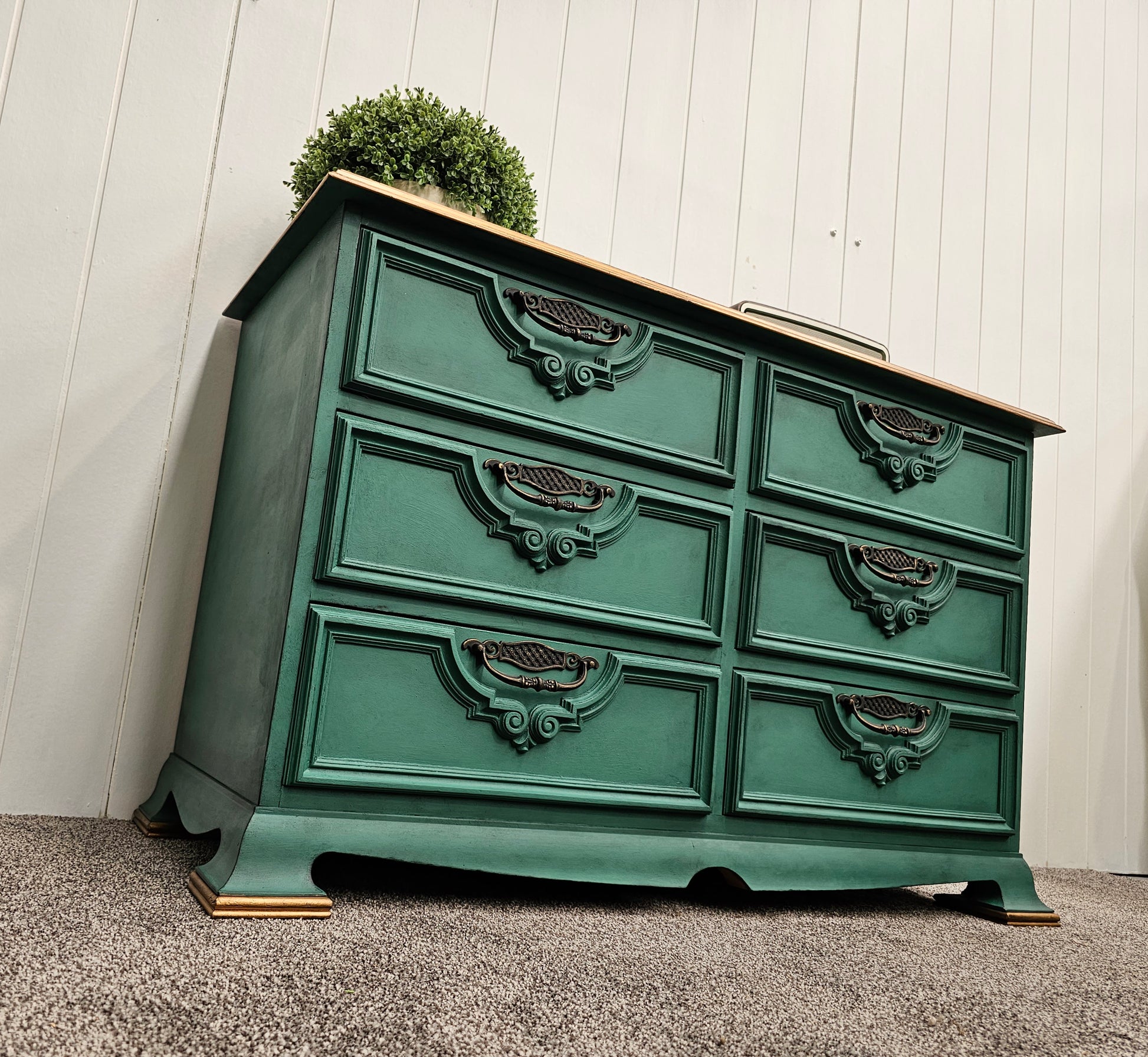 Command attention with The Emerald Empress, a striking vintage dresser reimagined in a lush, deep emerald green. This piece is all about power and poise—featuring ornate, baroque-style drawer fronts and heavy antique brass hardware that speaks to old-world craftsmanship.