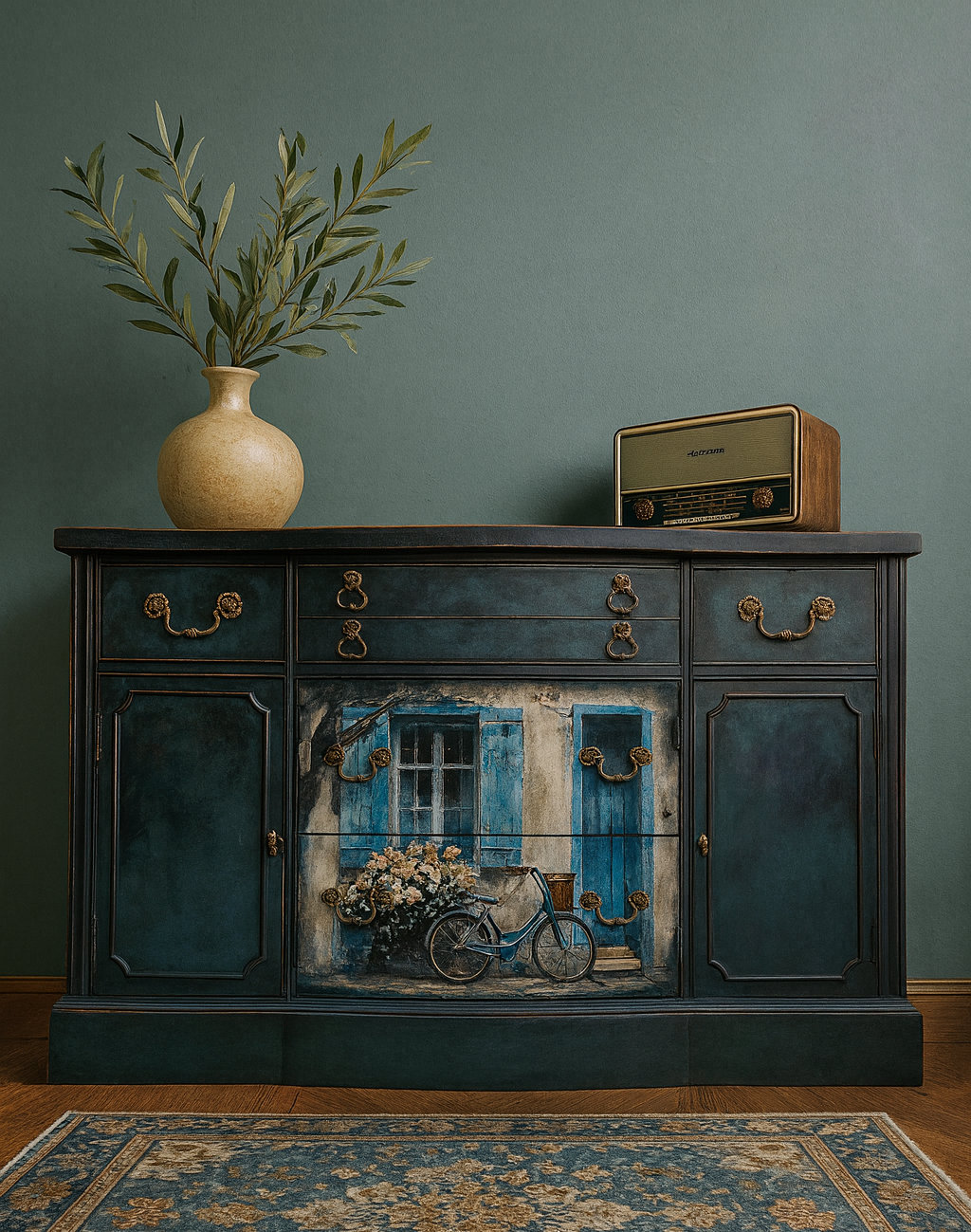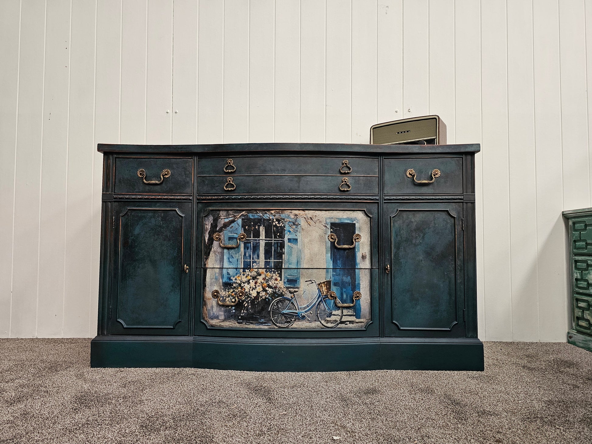 🔹 Finish: Deep moody teal with distressed blackened edges and a storybook-style decoupage panel