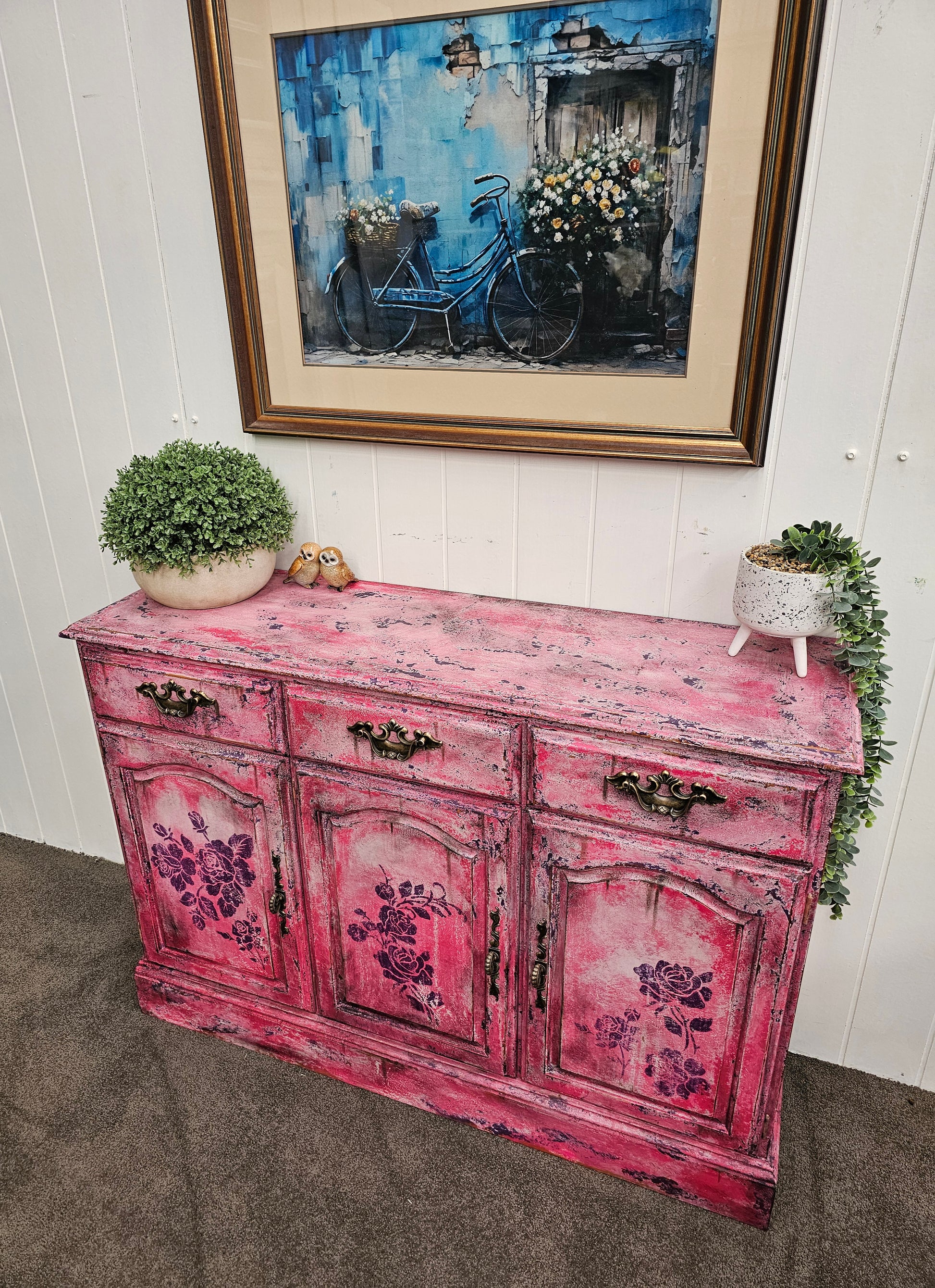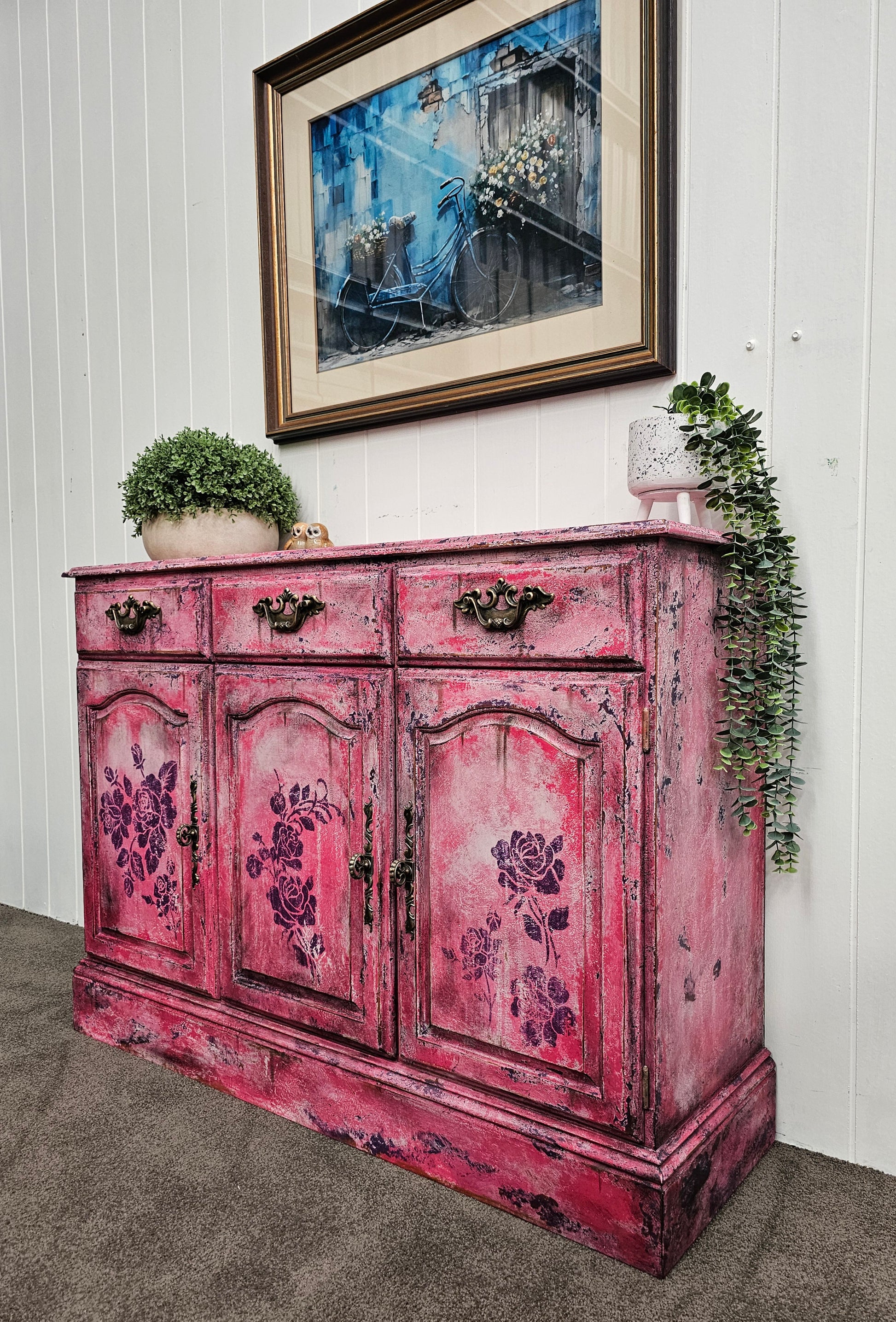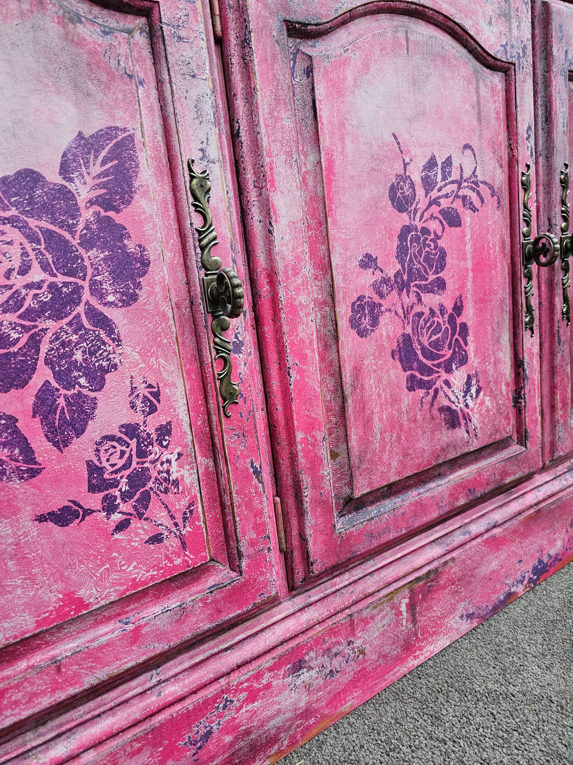 As if plucked from the studio of an old-world artist who painted with blossoms instead of brushes, Bloomin' Pink Patina is a cabinet steeped in romance and riotous colour. This piece celebrates age, texture, and the vivid beauty of layered pinks, as rose stencils unfurl like inked poetry across a timeworn canvas.