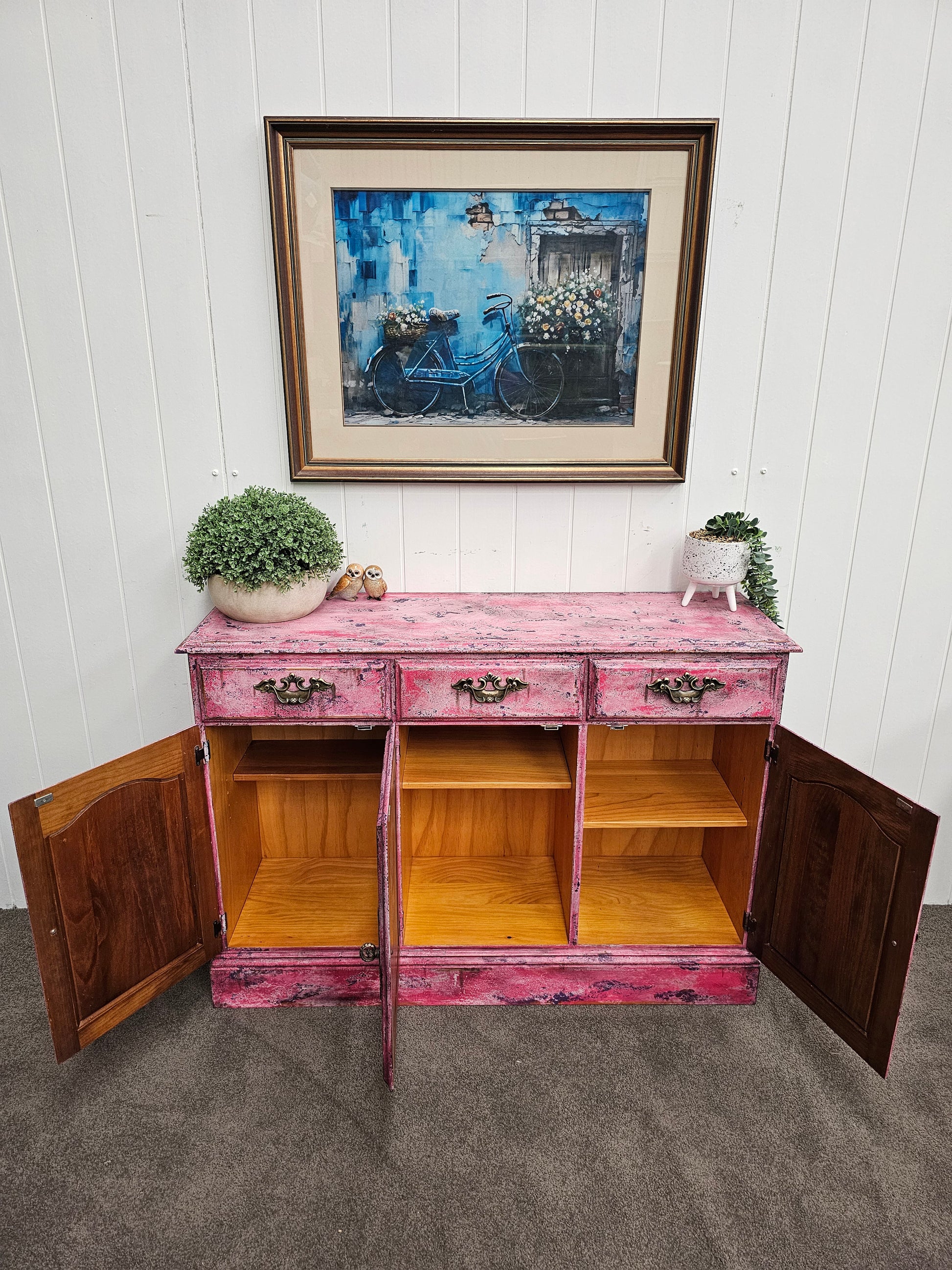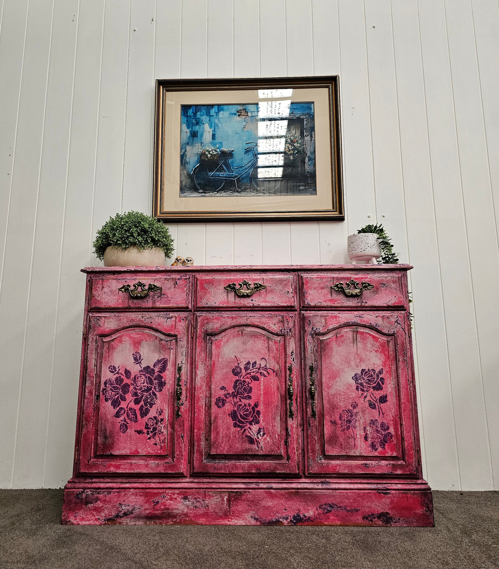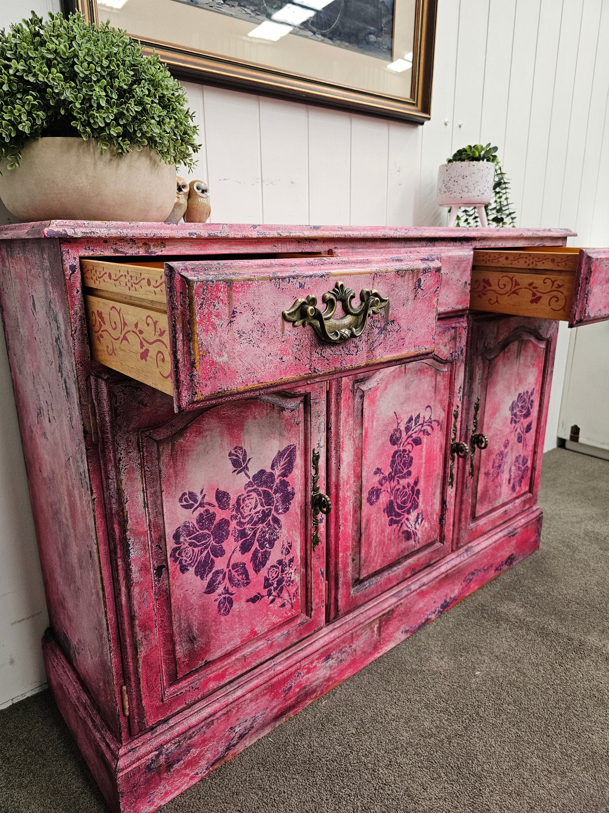 As if plucked from the studio of an old-world artist who painted with blossoms instead of brushes, Bloomin' Pink Patina is a cabinet steeped in romance and riotous colour. This piece celebrates age, texture, and the vivid beauty of layered pinks, as rose stencils unfurl like inked poetry across a timeworn canvas.