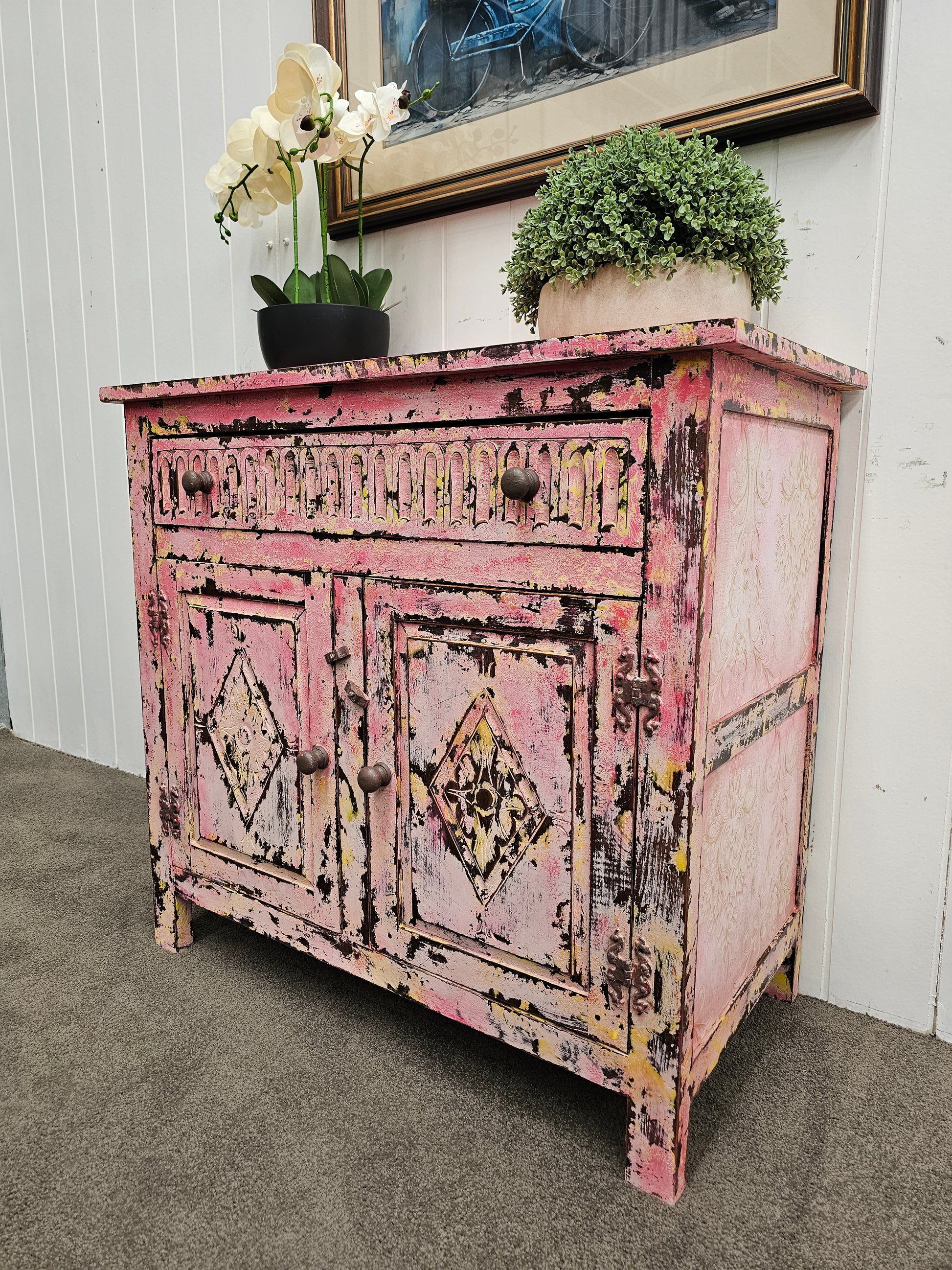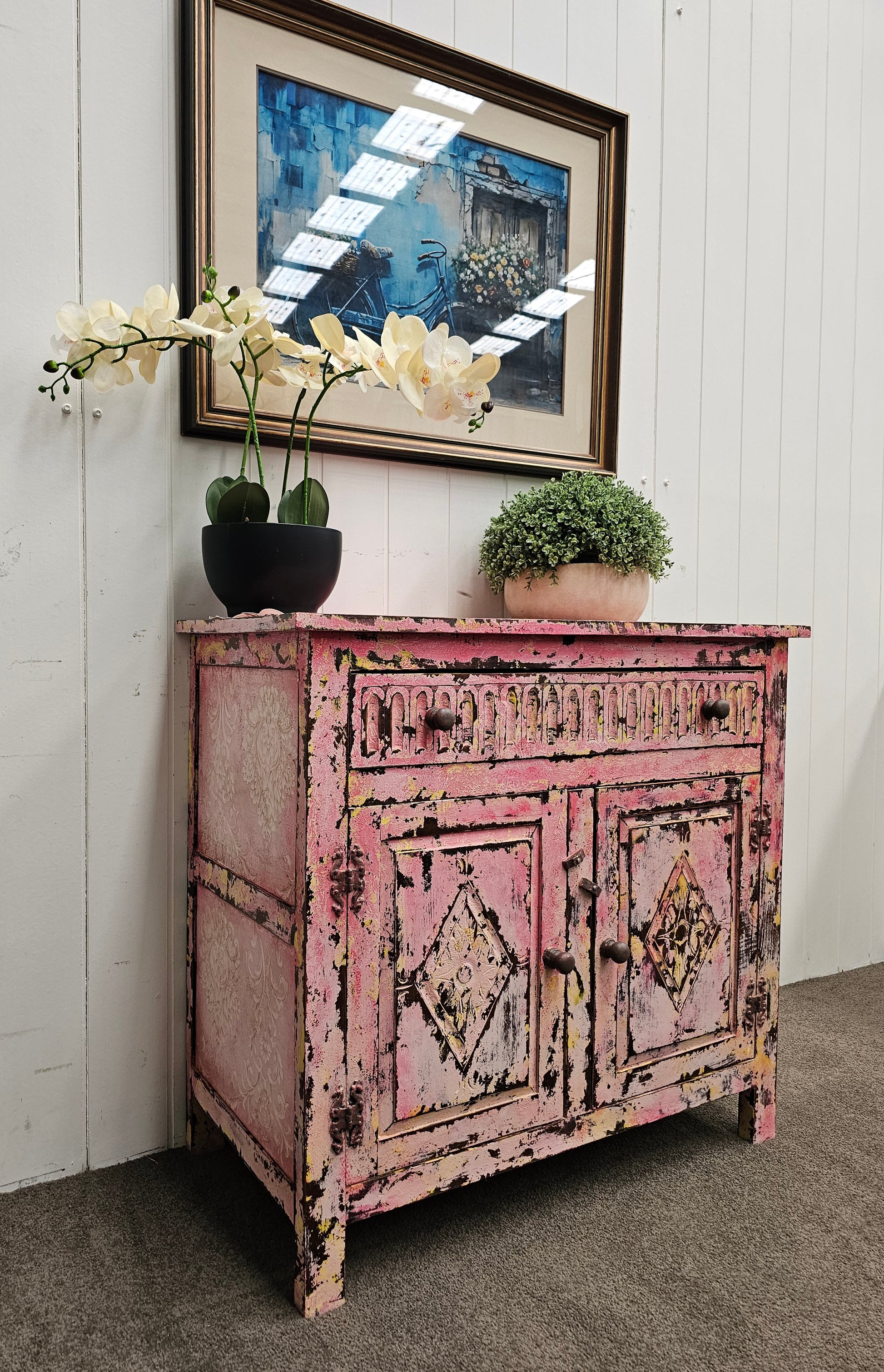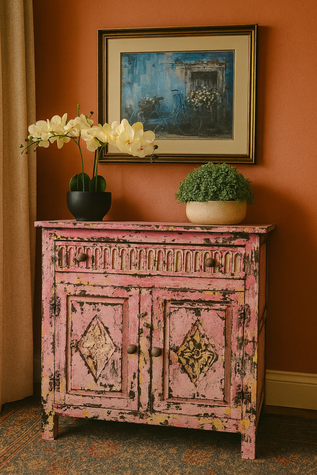 🔹 Finish: Multi-layered chippy patina in blush, white, and clay-pink tones