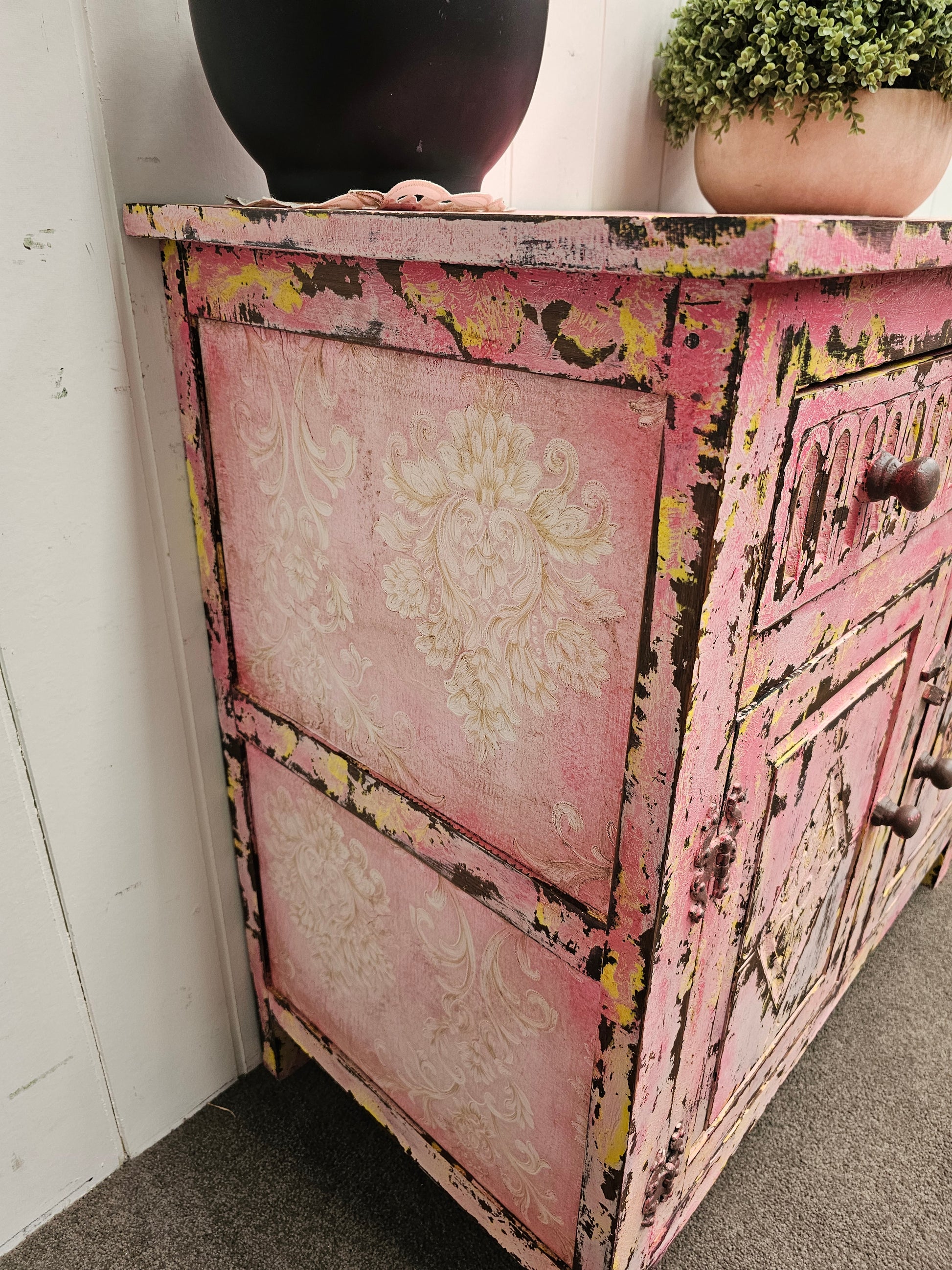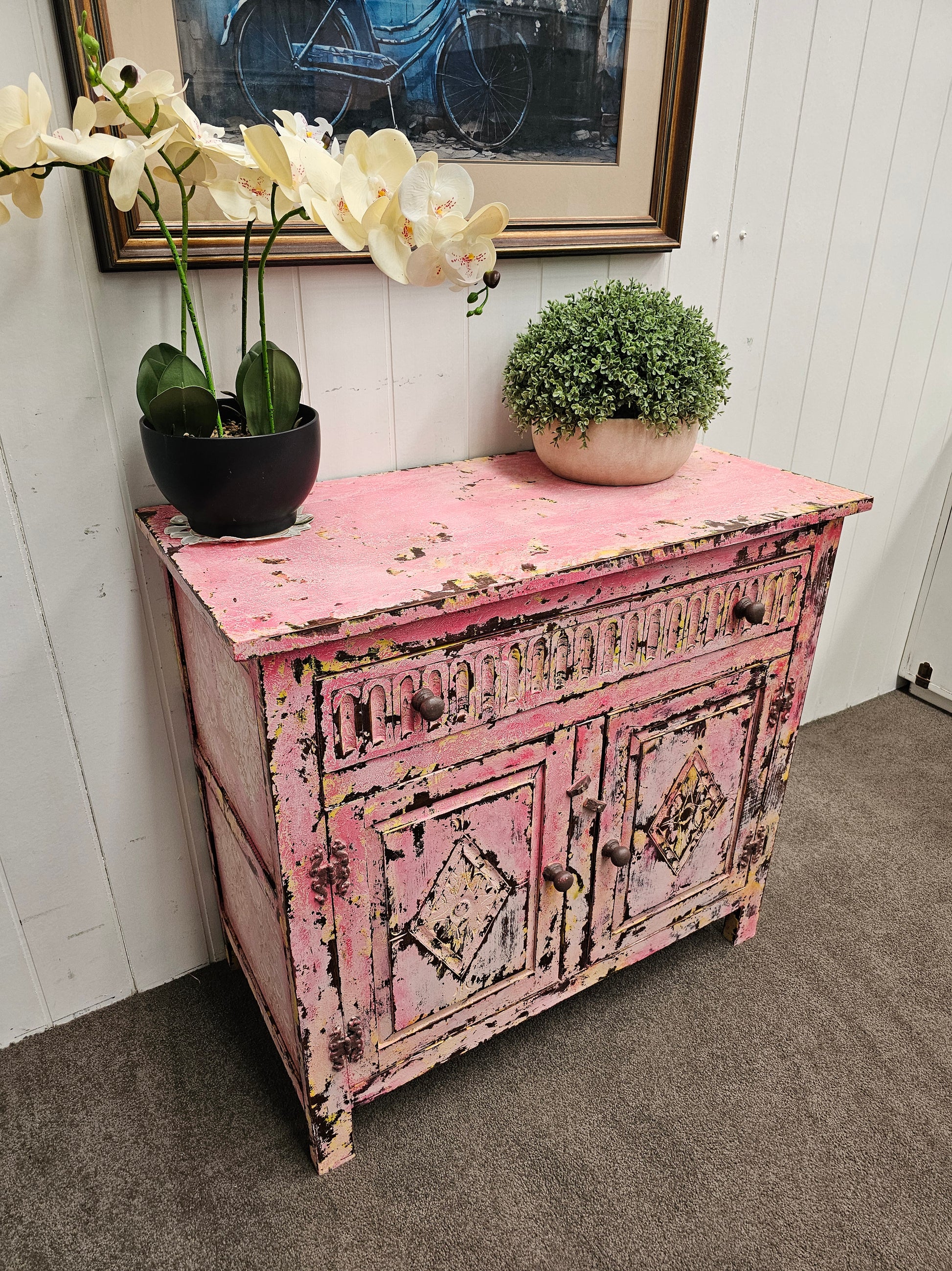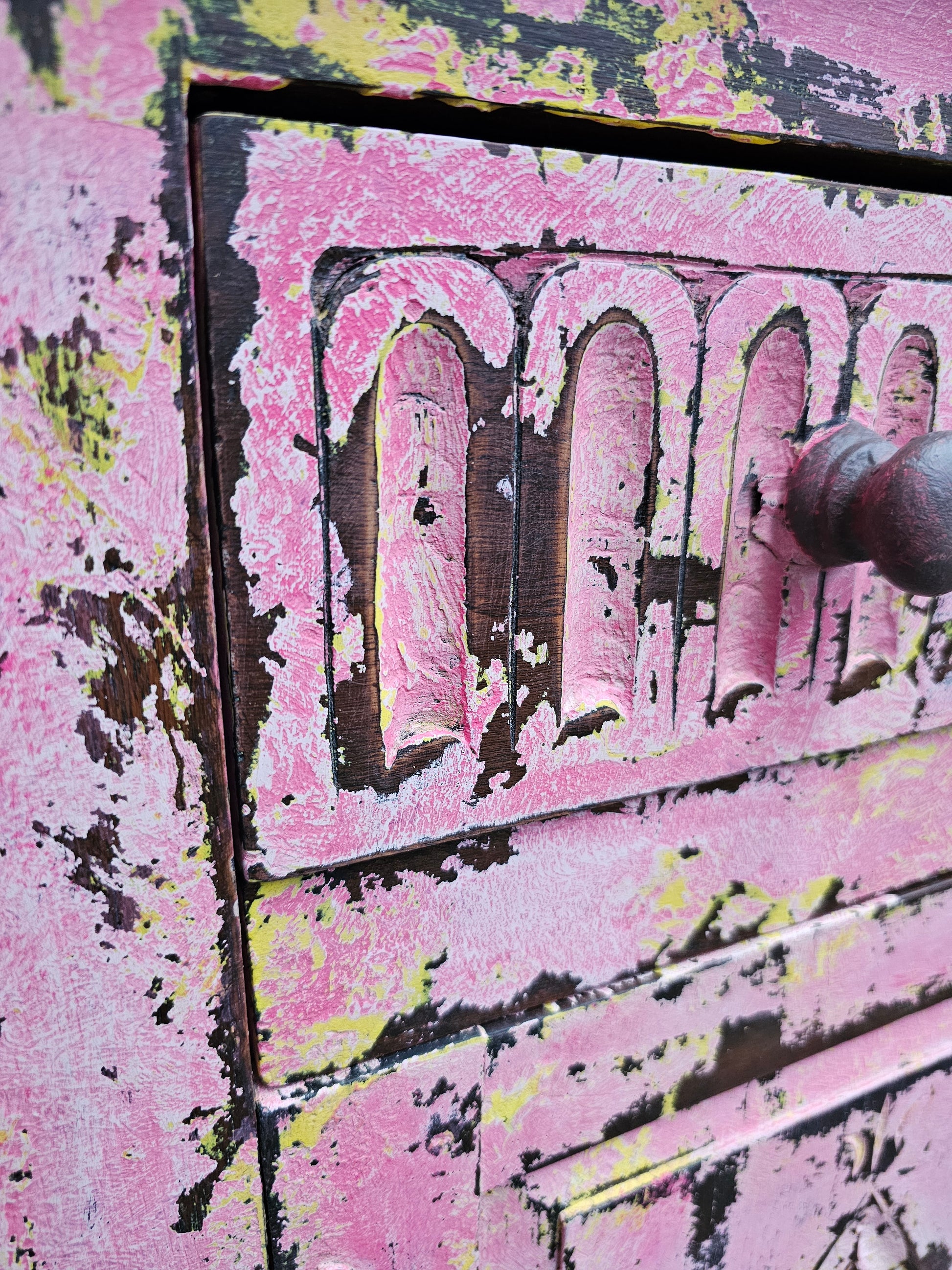🔹 Finish: Multi-layered chippy patina in blush, white, and clay-pink tones