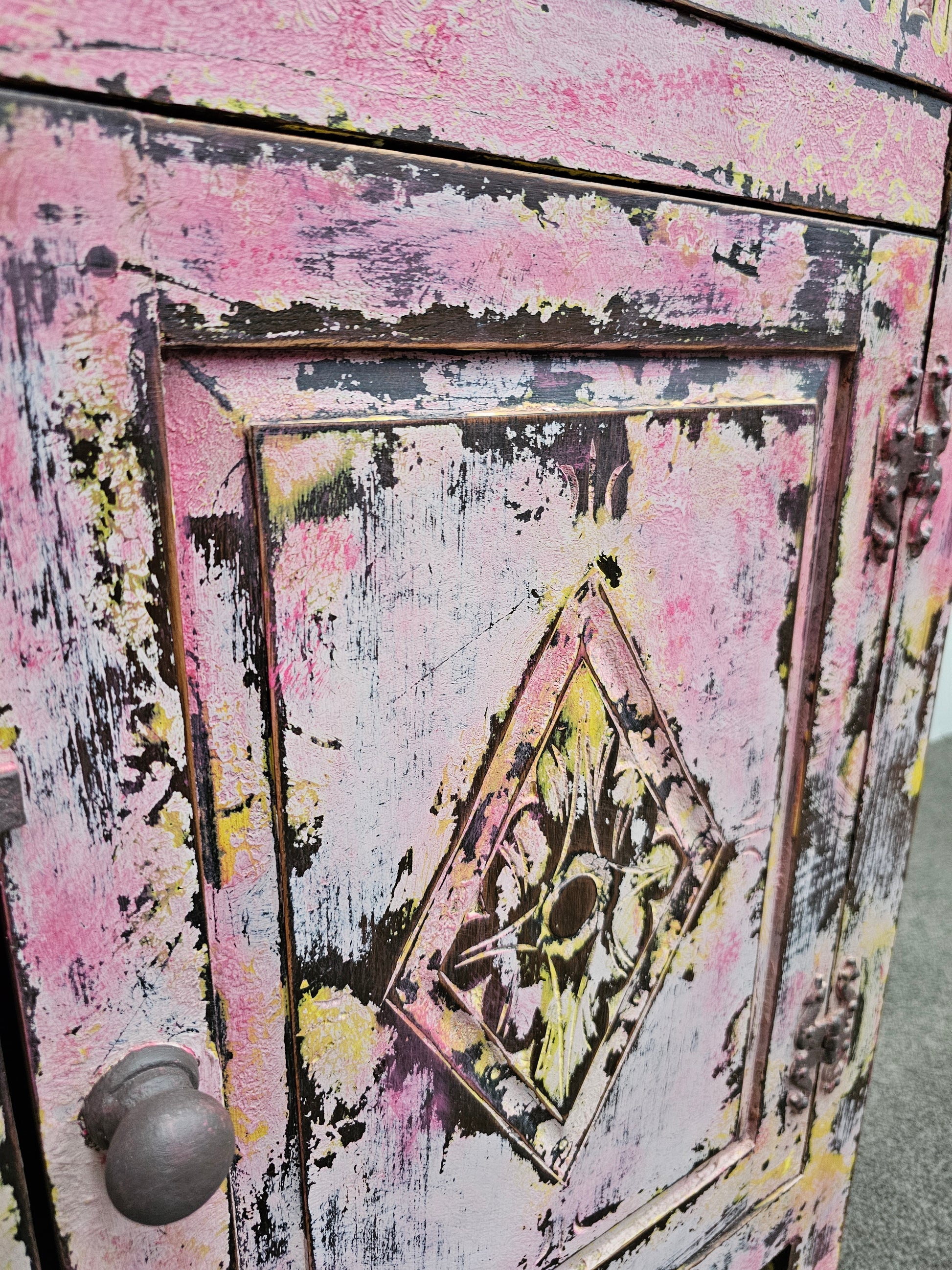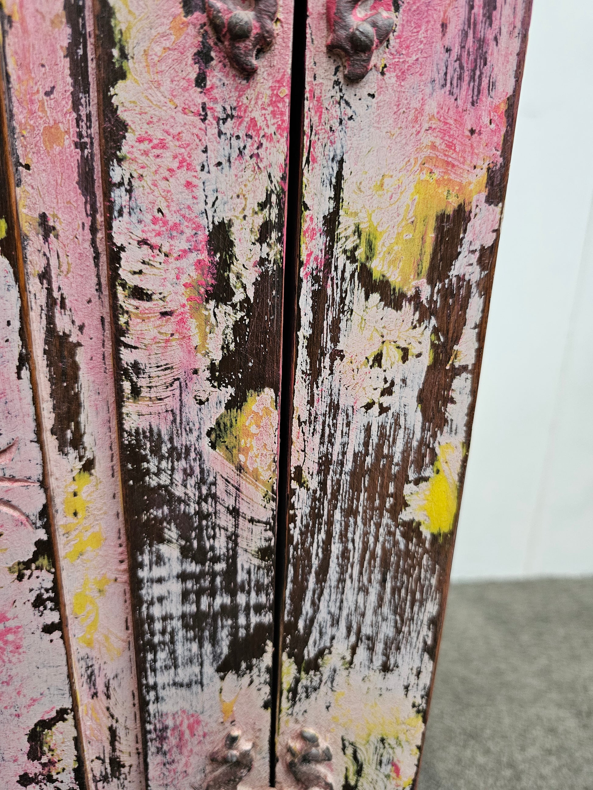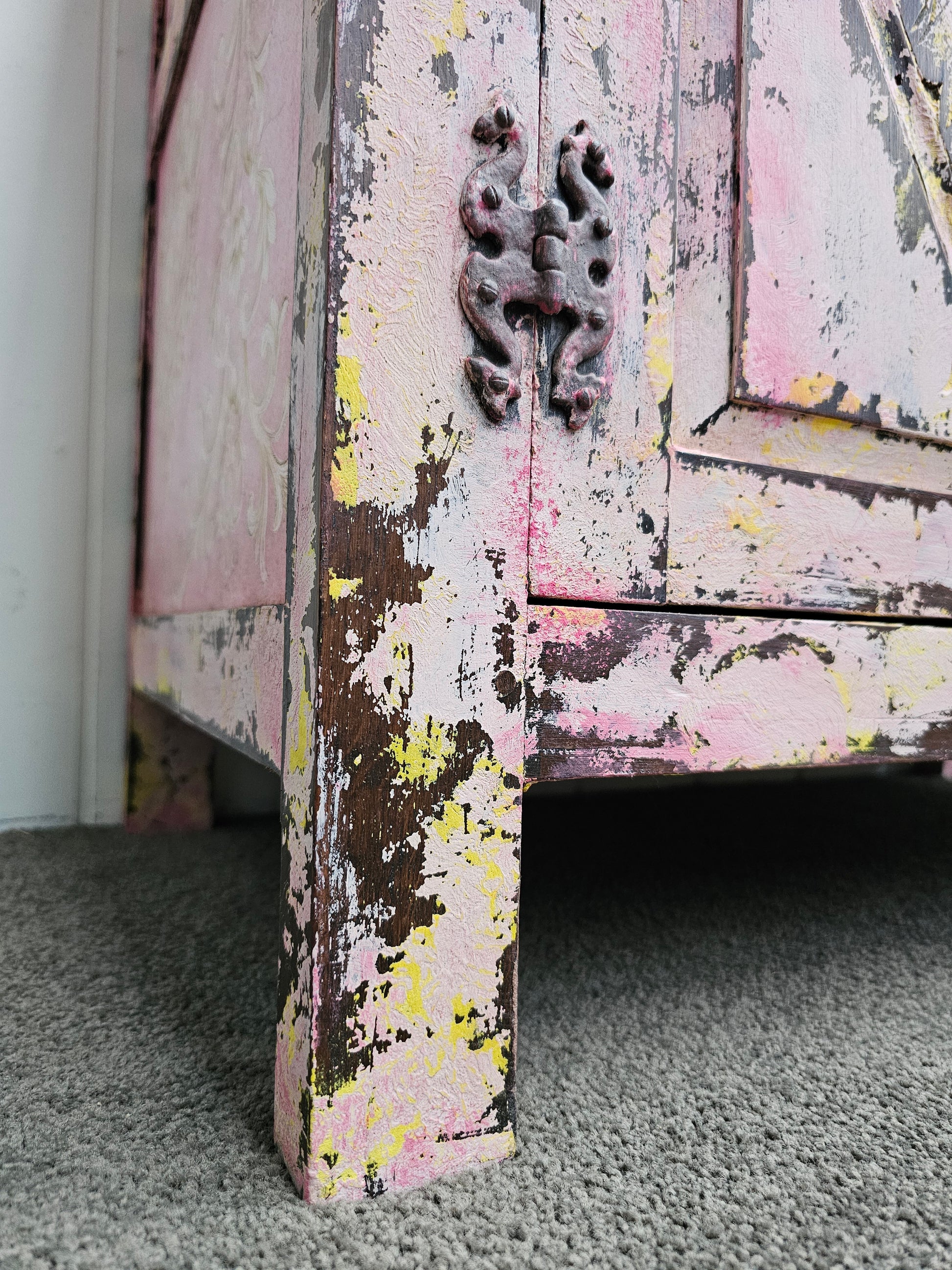 Weathered by time and softened by pink, Blush Relic carries the charm of a sun-aged cottage by the sea. Its surface tells a story in layers — chalky whites, blush-pinks, and hints of darkwood peeking through a beautifully chippy, distressed finish. The patina is raw yet refined, like paint faded by salt air and long summers.