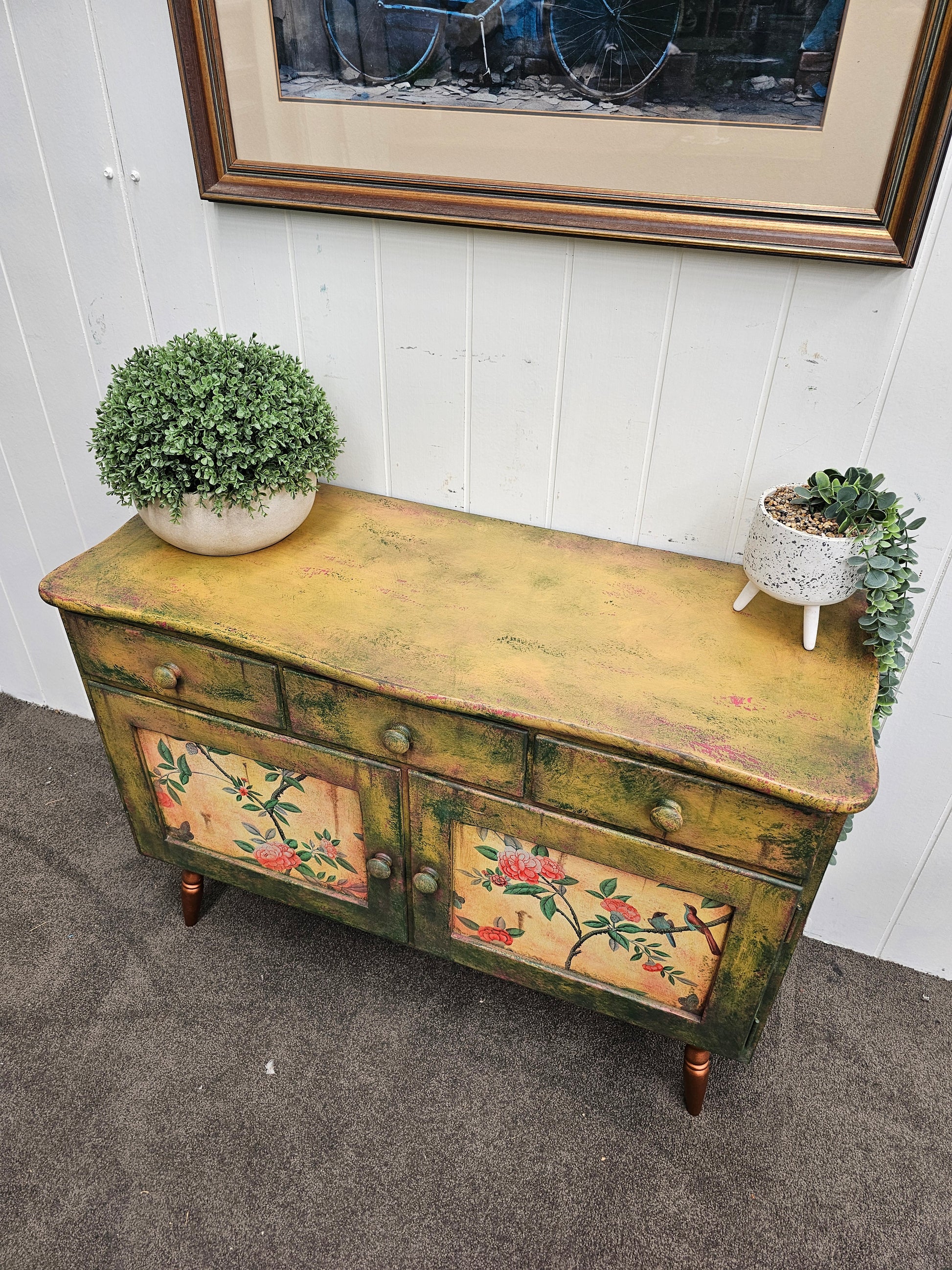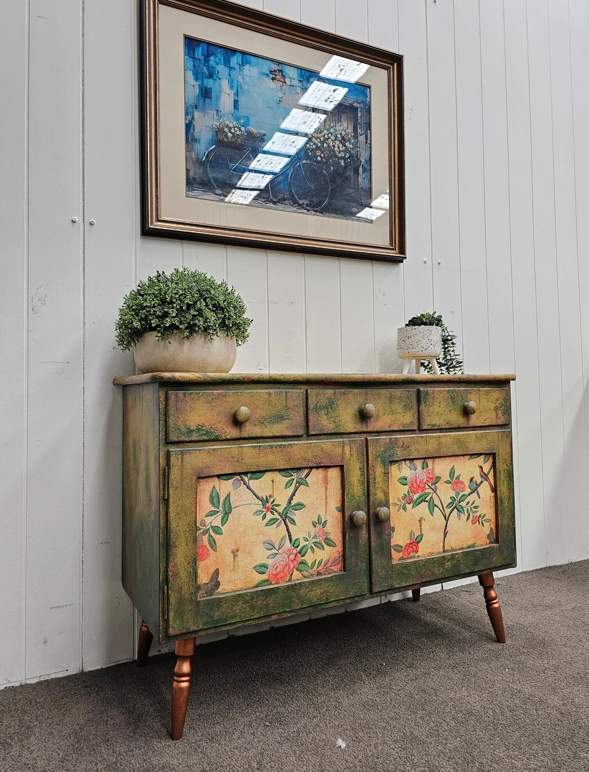 🔹 Finish: Distressed moss green with golden vine relief panels