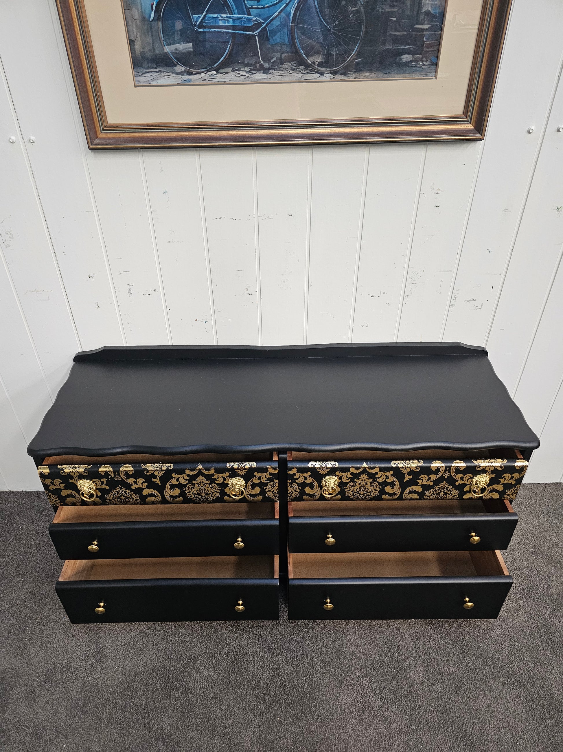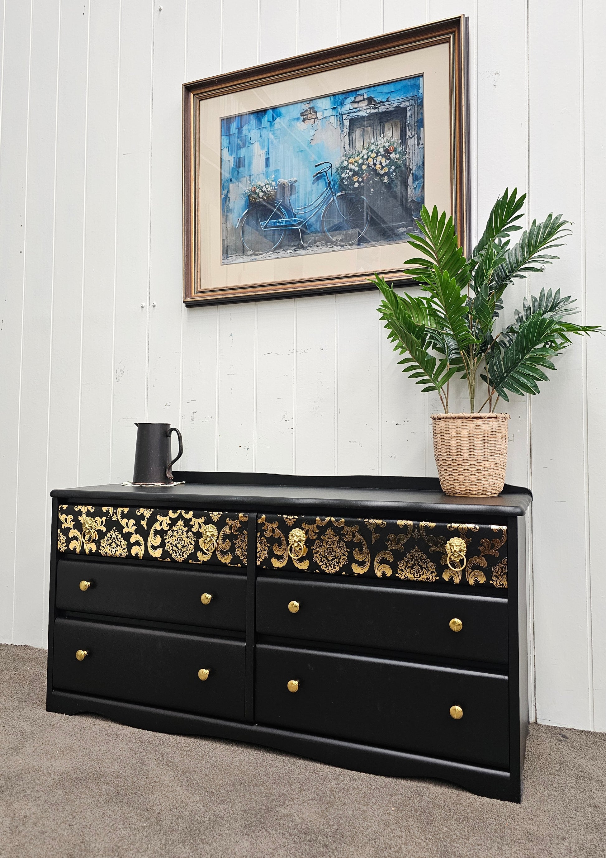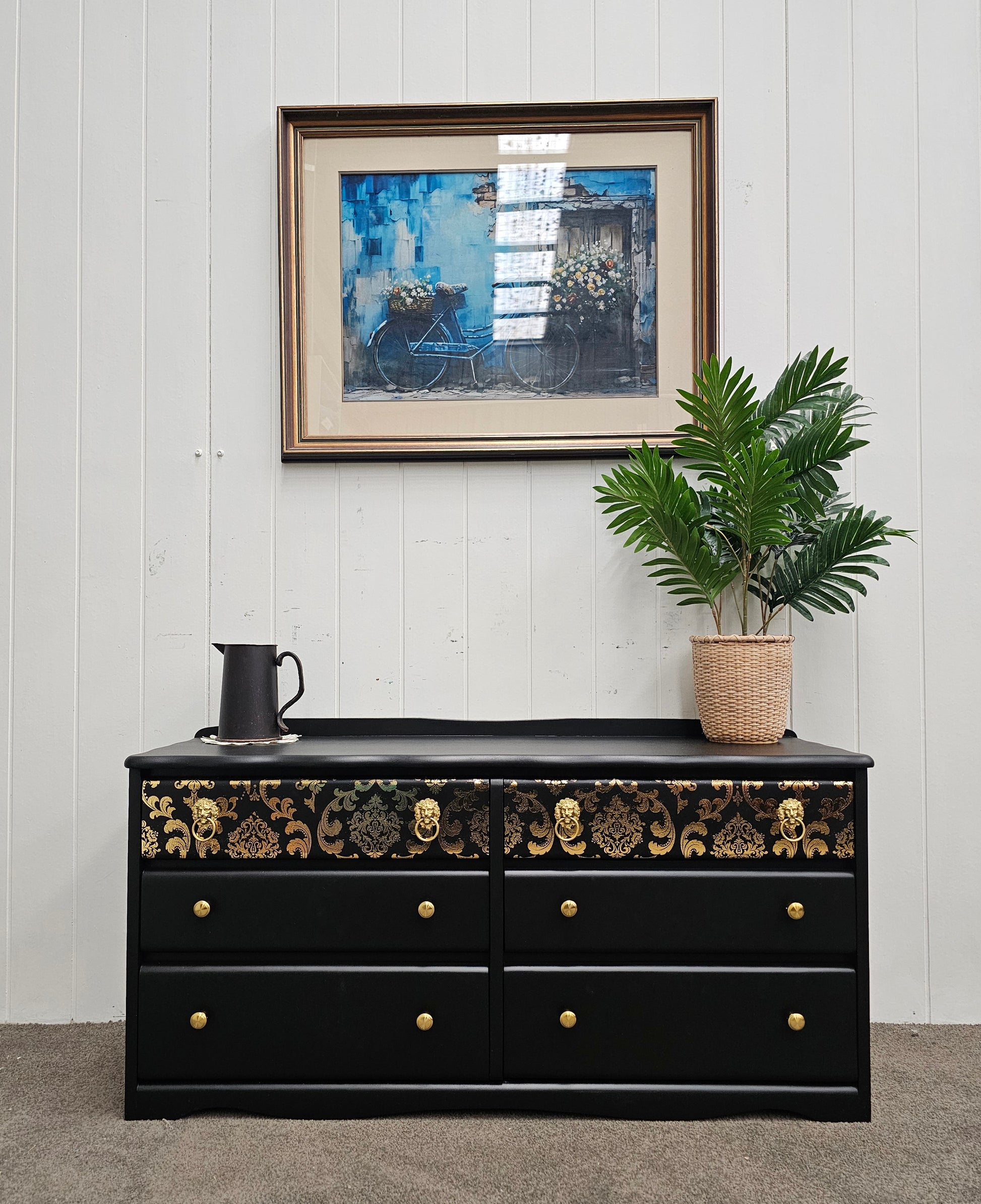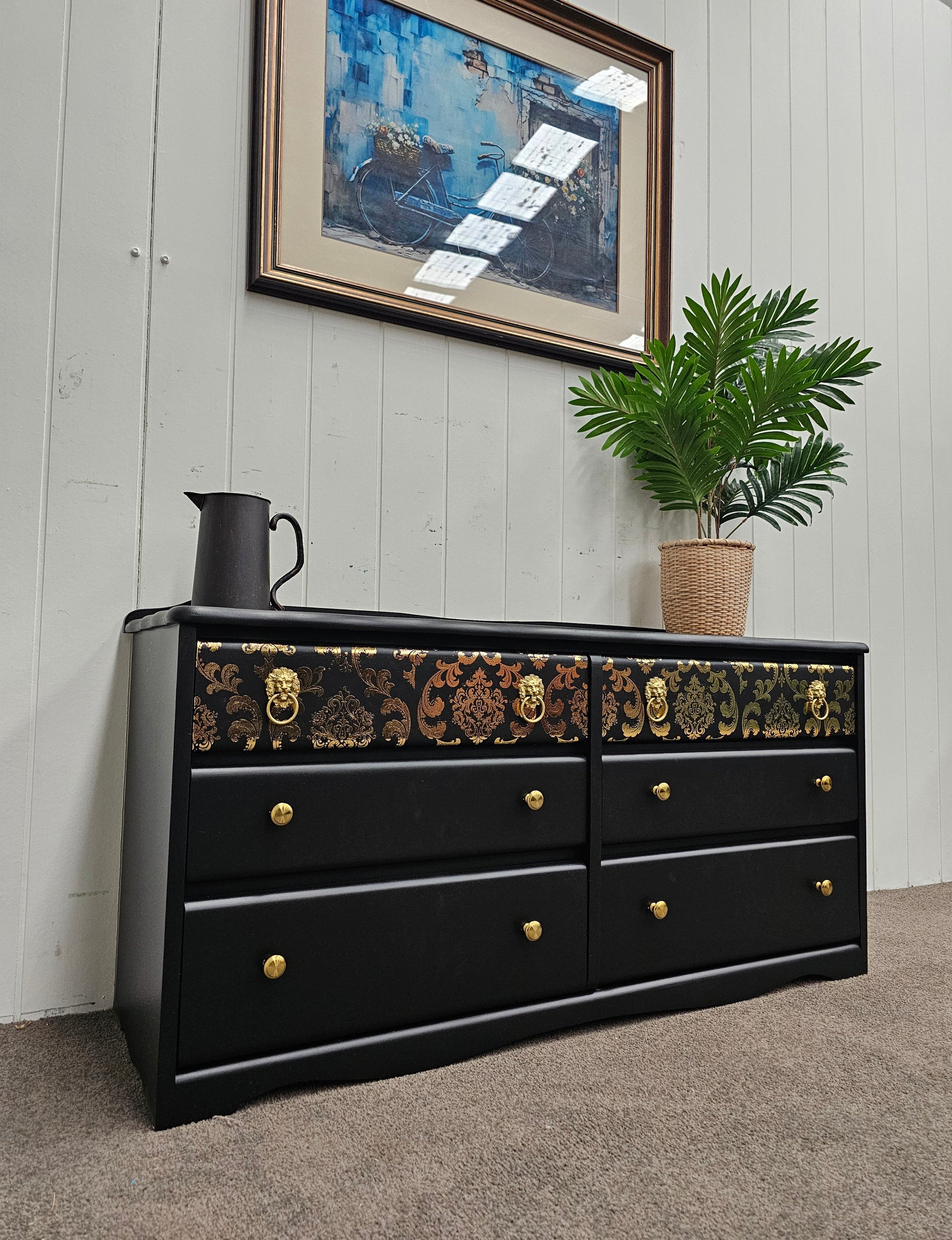 Midnight Majestic strikes a chord of old-world grandeur and modern allure. Swathed in deepest black and gilded with lavish gold damask, this piece doesn’t whisper — it declares. Regal lion-head pulls and intricate flourishes evoke palatial halls and velvet-draped salons, while the sleek silhouette keeps it rooted in the now.