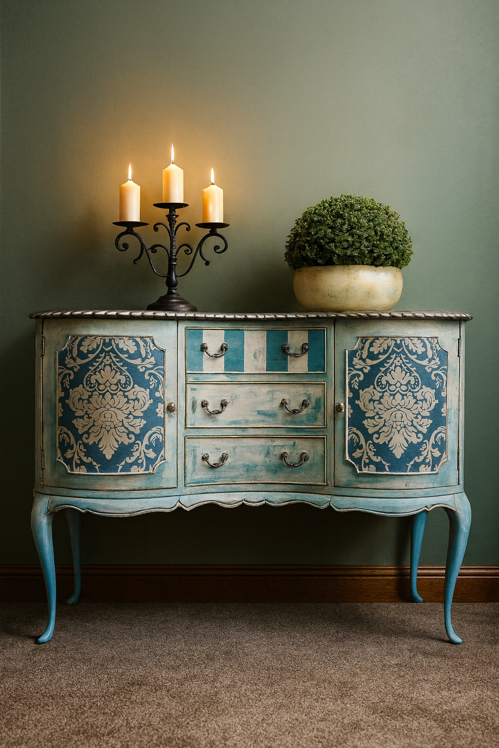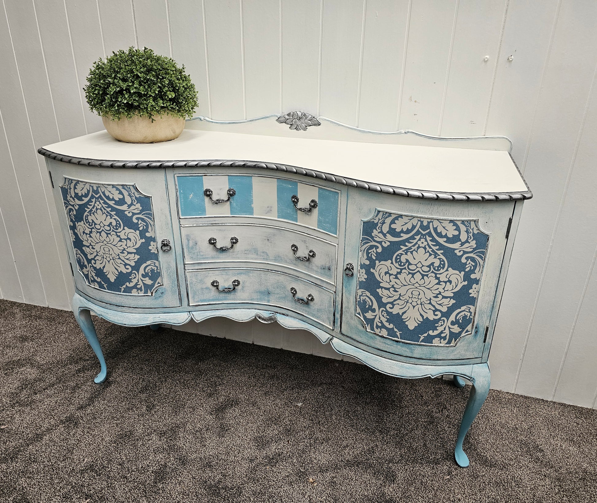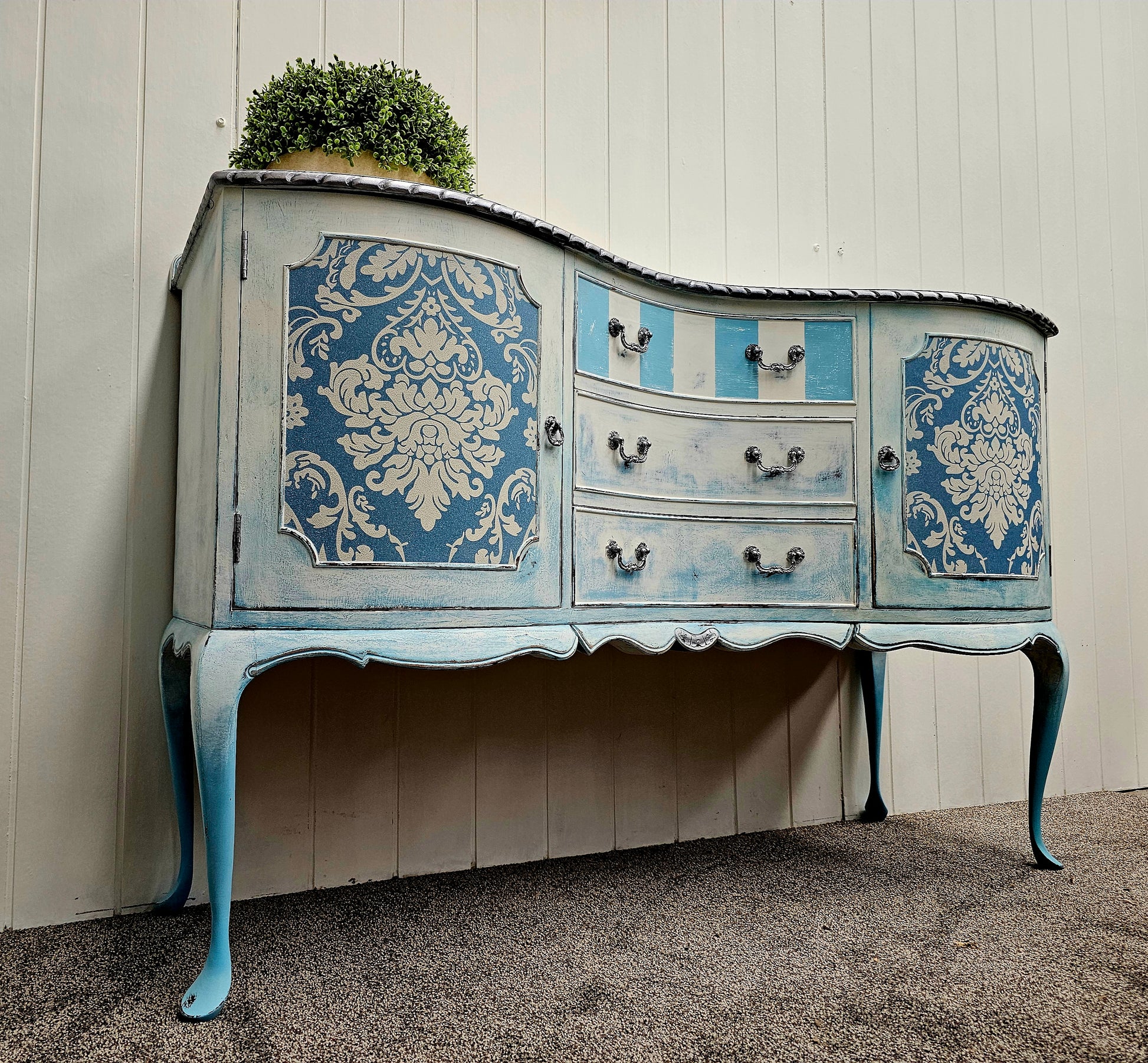 Step into timeless elegance with The Versailles Blues, a statement sideboard that marries French Provincial sophistication with coastal serenity. Featuring ornate damask panels, soft powder blues, and hand-distressed finishes, this piece channels the opulence of Versailles with the lighthearted charm of a seaside villa.