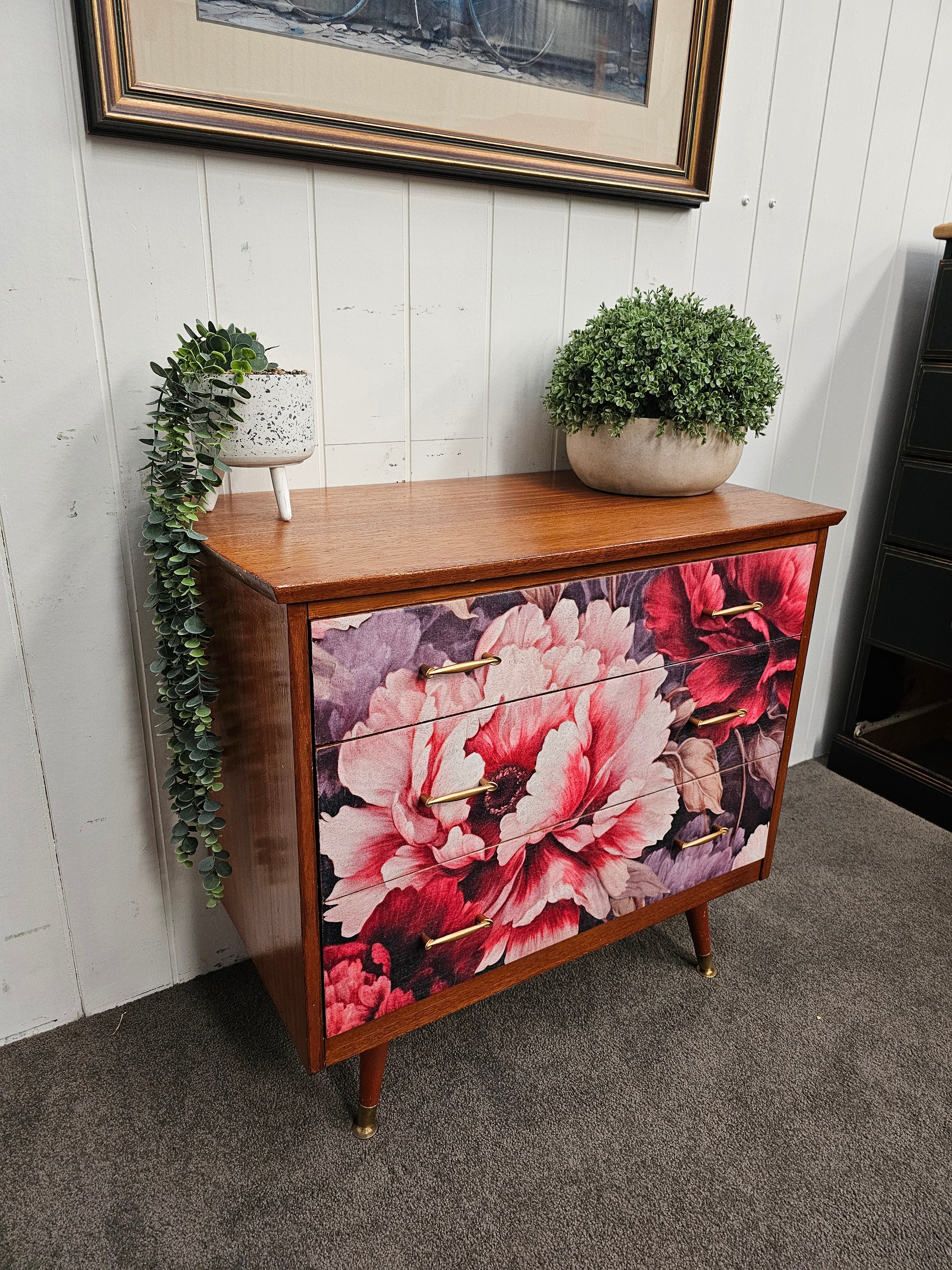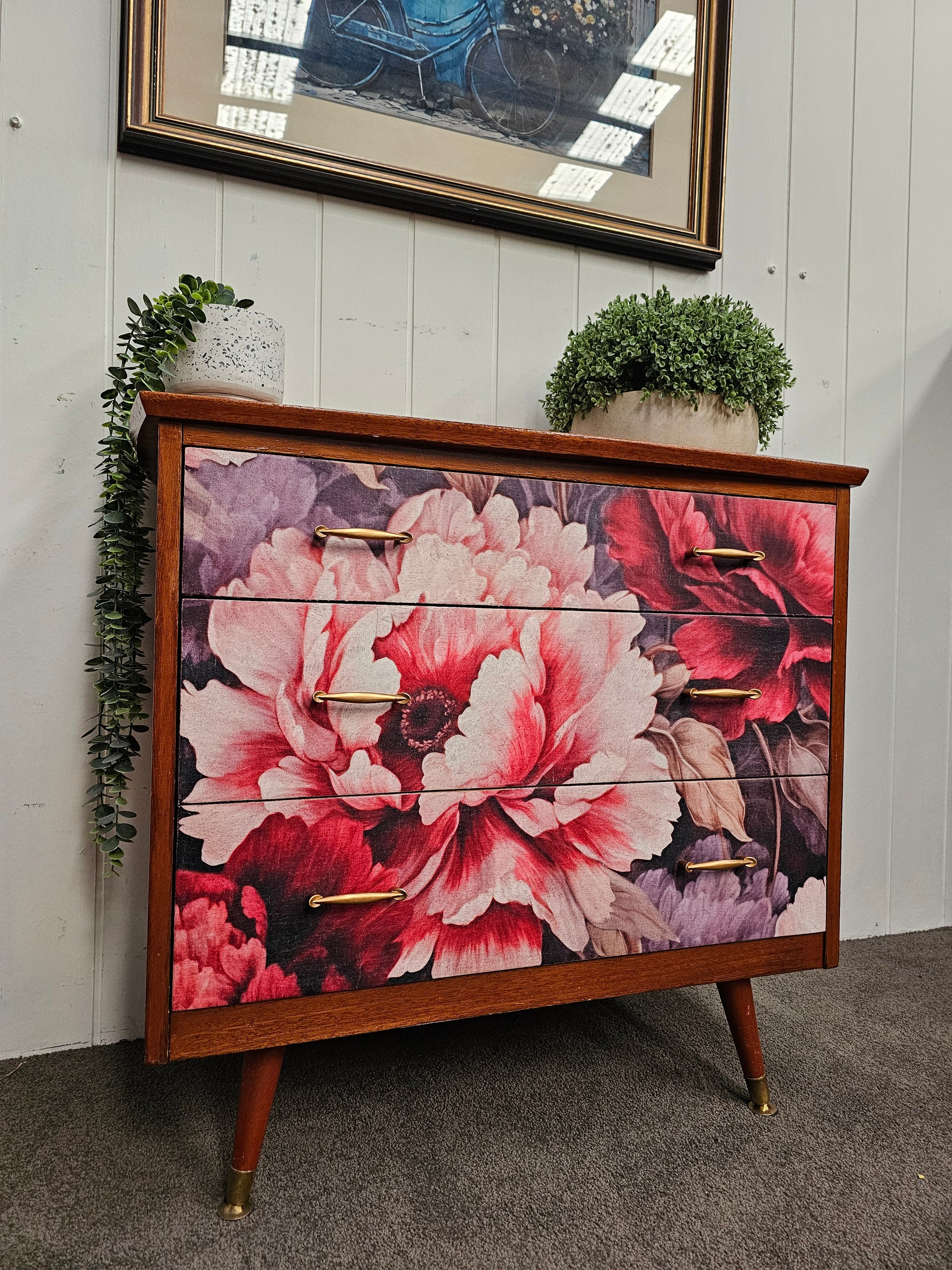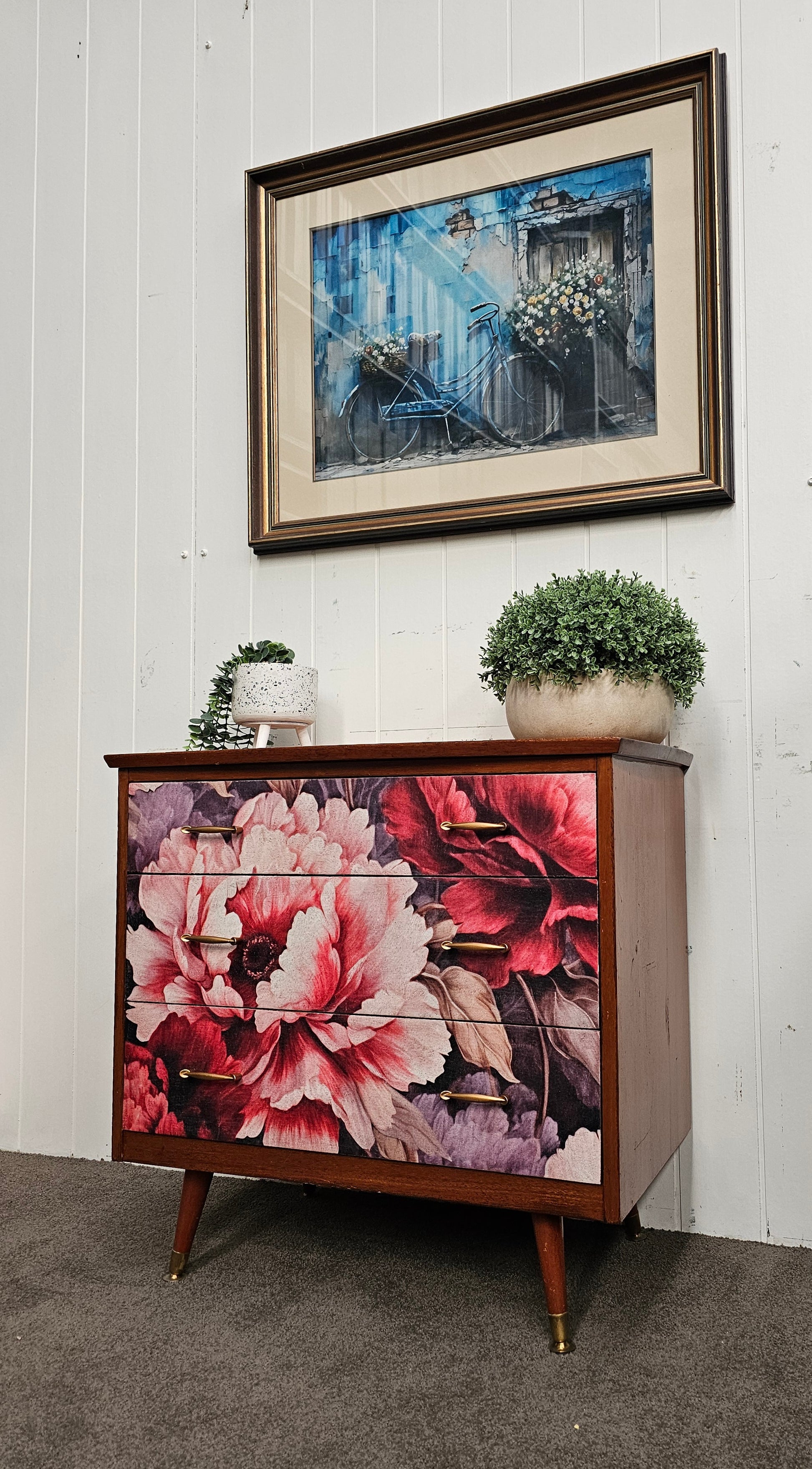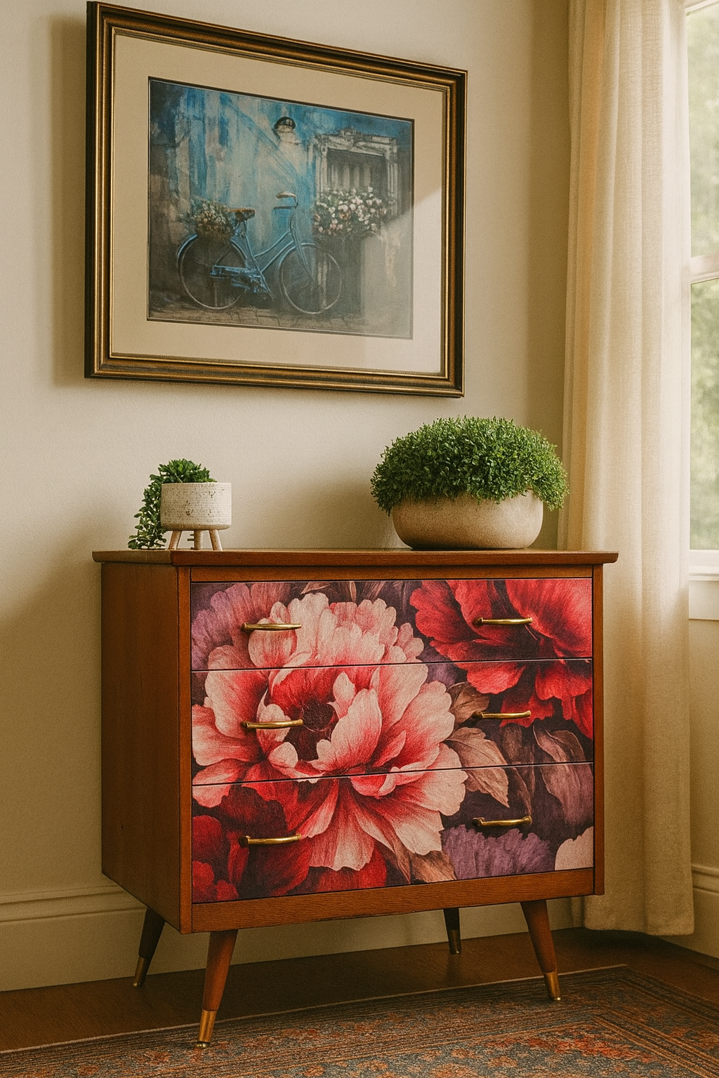 A floral rhapsody composed in bold strokes and vintage rhythm, Peony Waltz is both siren and serenade. Rich mahogany tones frame a magnificent bloomscape: oversized peonies in rose, wine, and dusk-violet swirl across the drawers like silk skirts in mid-twirl. This is furniture as poetry — romantic, powerful, and alive with movement.