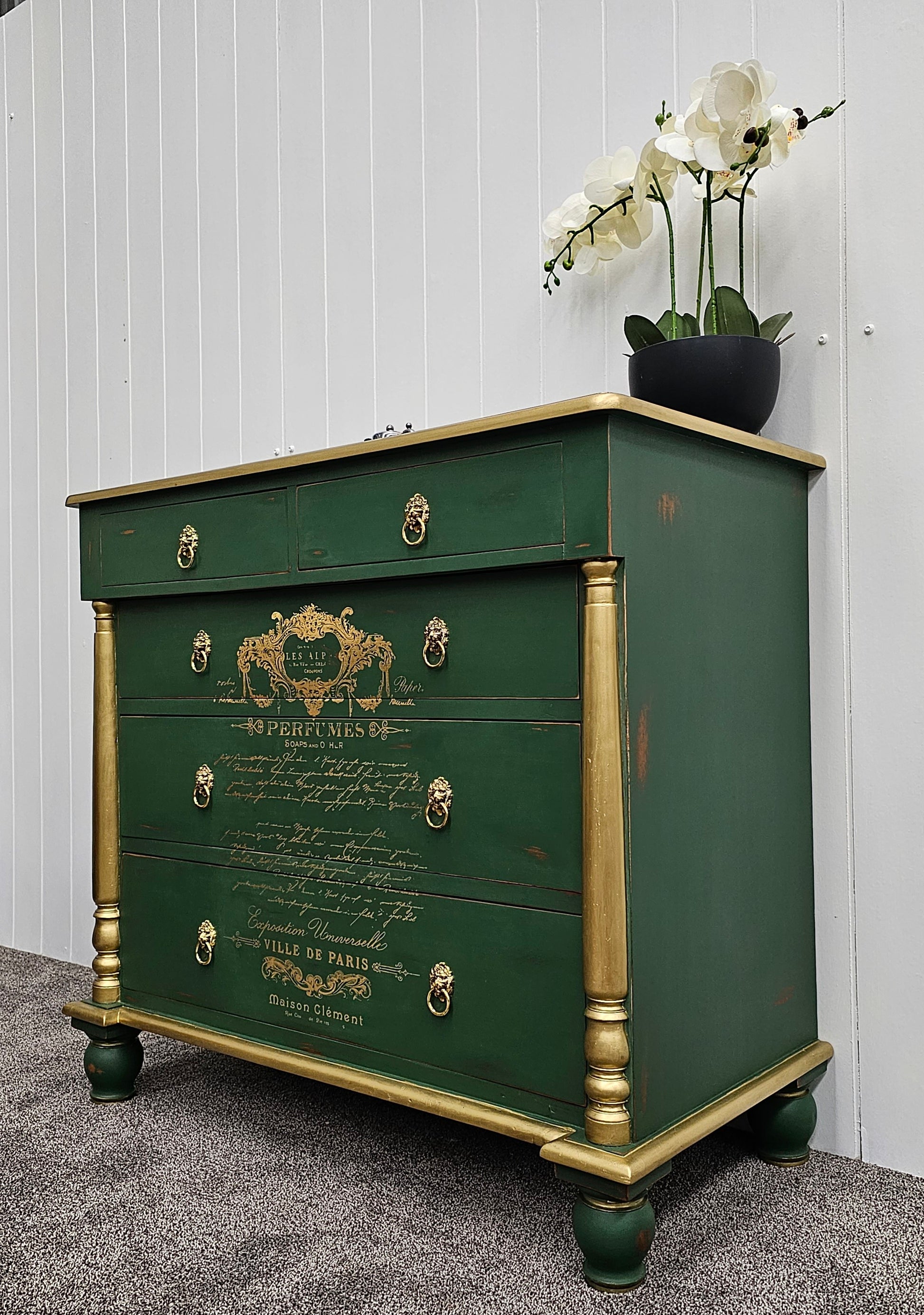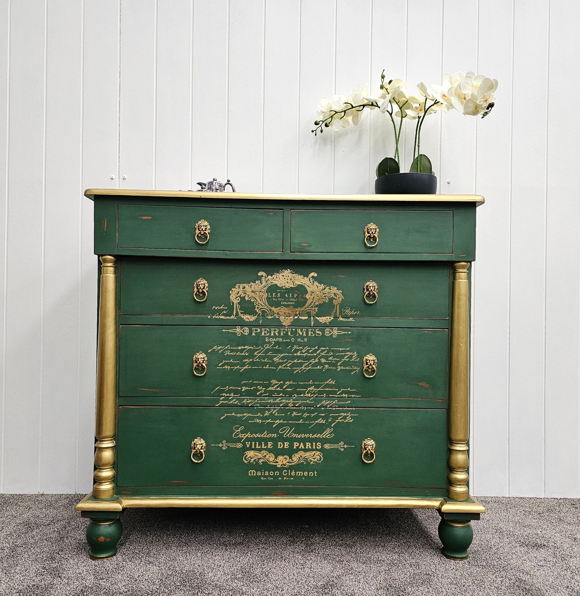 Elevate your space with the timeless opulence of The Parisian Regent, a majestic chest of drawers inspired by the glamour of old-world Paris. Cloaked in deep emerald green and crowned with ornate gold accents, this piece channels the romance of 19th-century French design.
