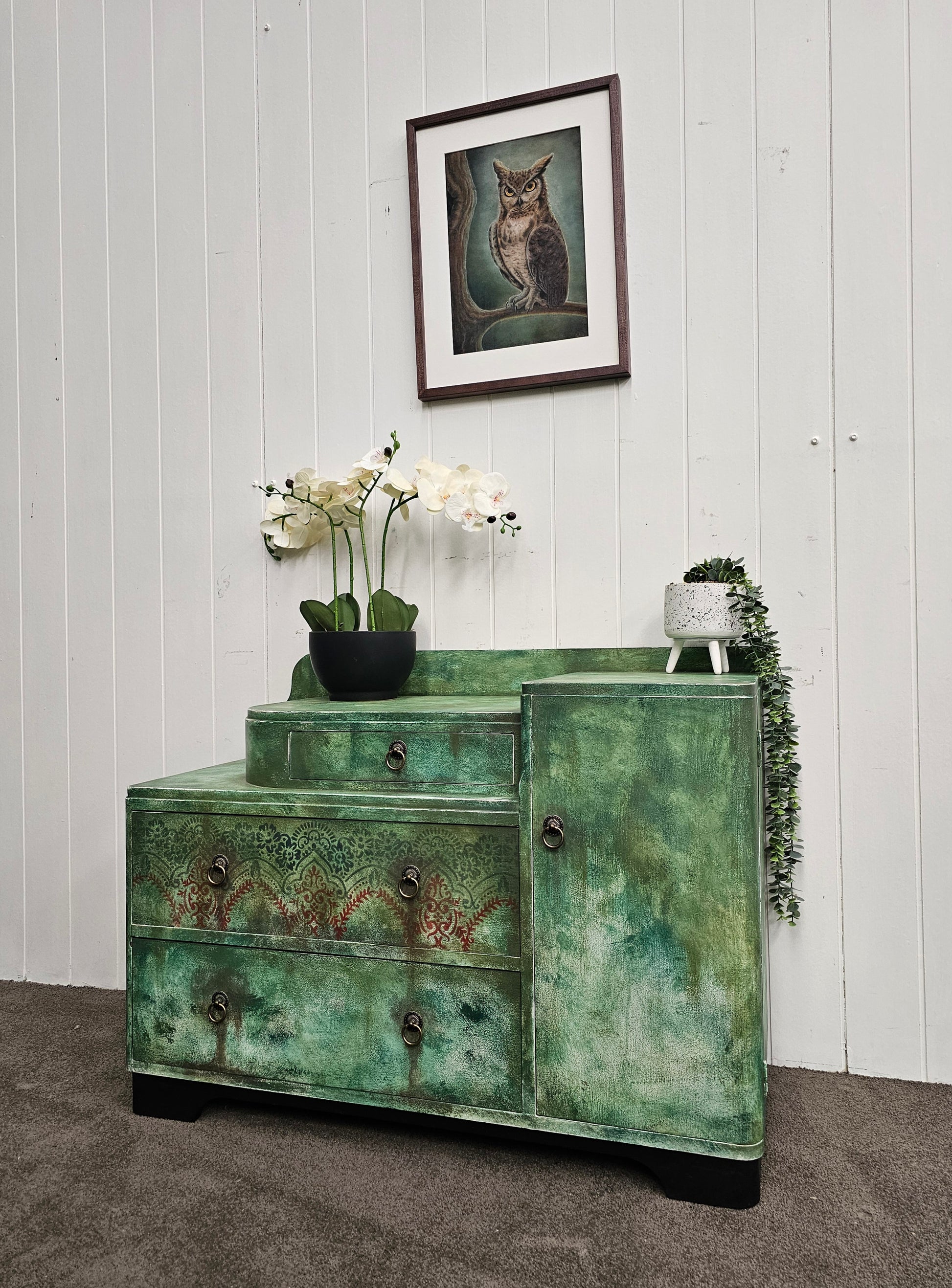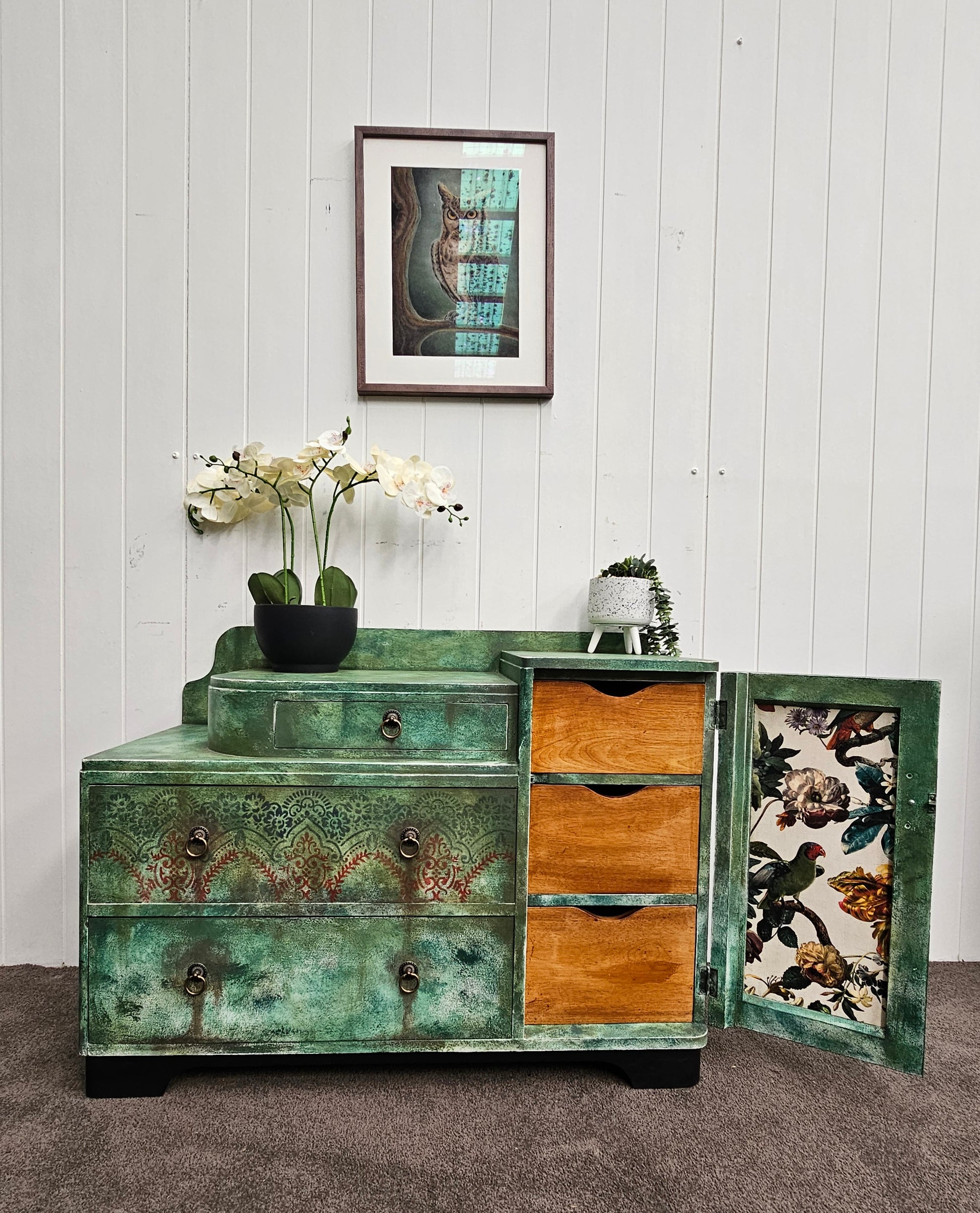 Step into the calm of a woodland morning with Forrest Nook, a thoughtfully transformed vintage oak dresser that feels like it’s been plucked from a storybook cottage. With its soft, layered green finish, ornate stencilling, and botanical interior detailing, this piece brings a gentle, natural elegance to any room.