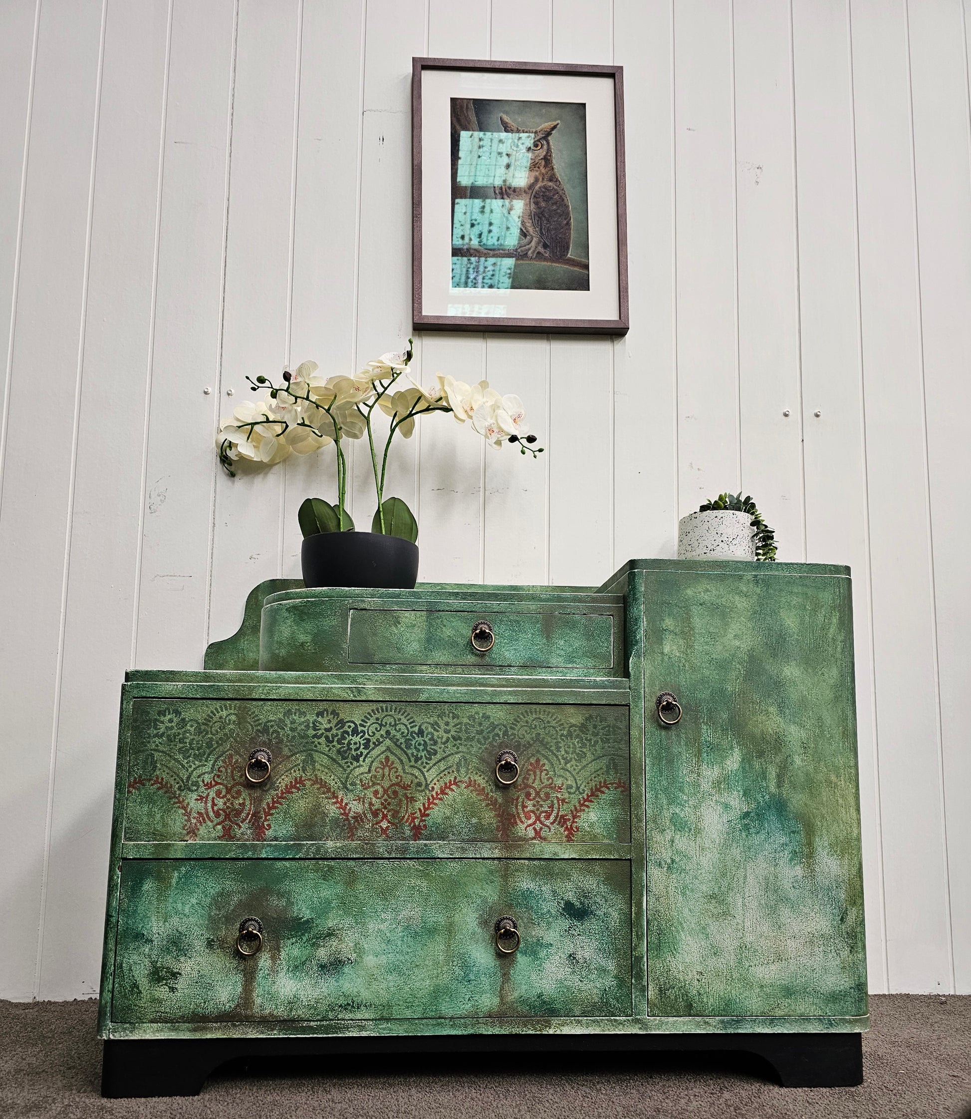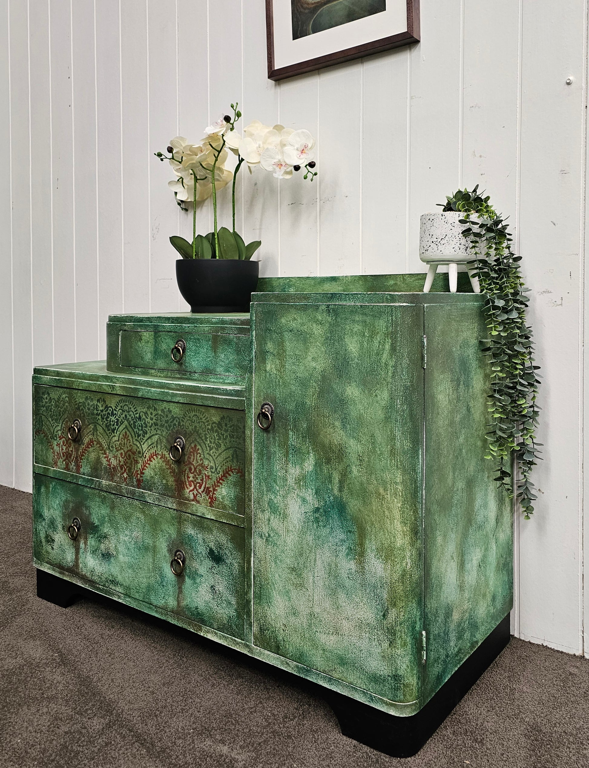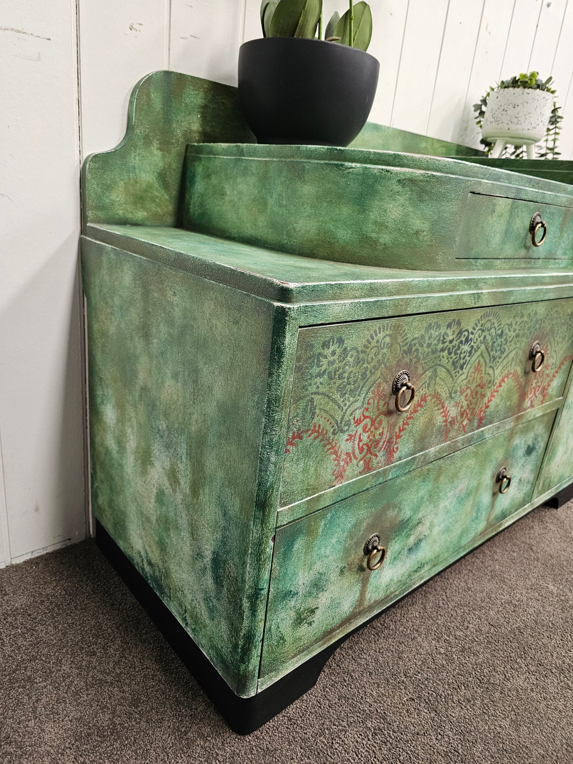 🔹 Finish: Hand-painted forest green with layered textures and stenciled patterns