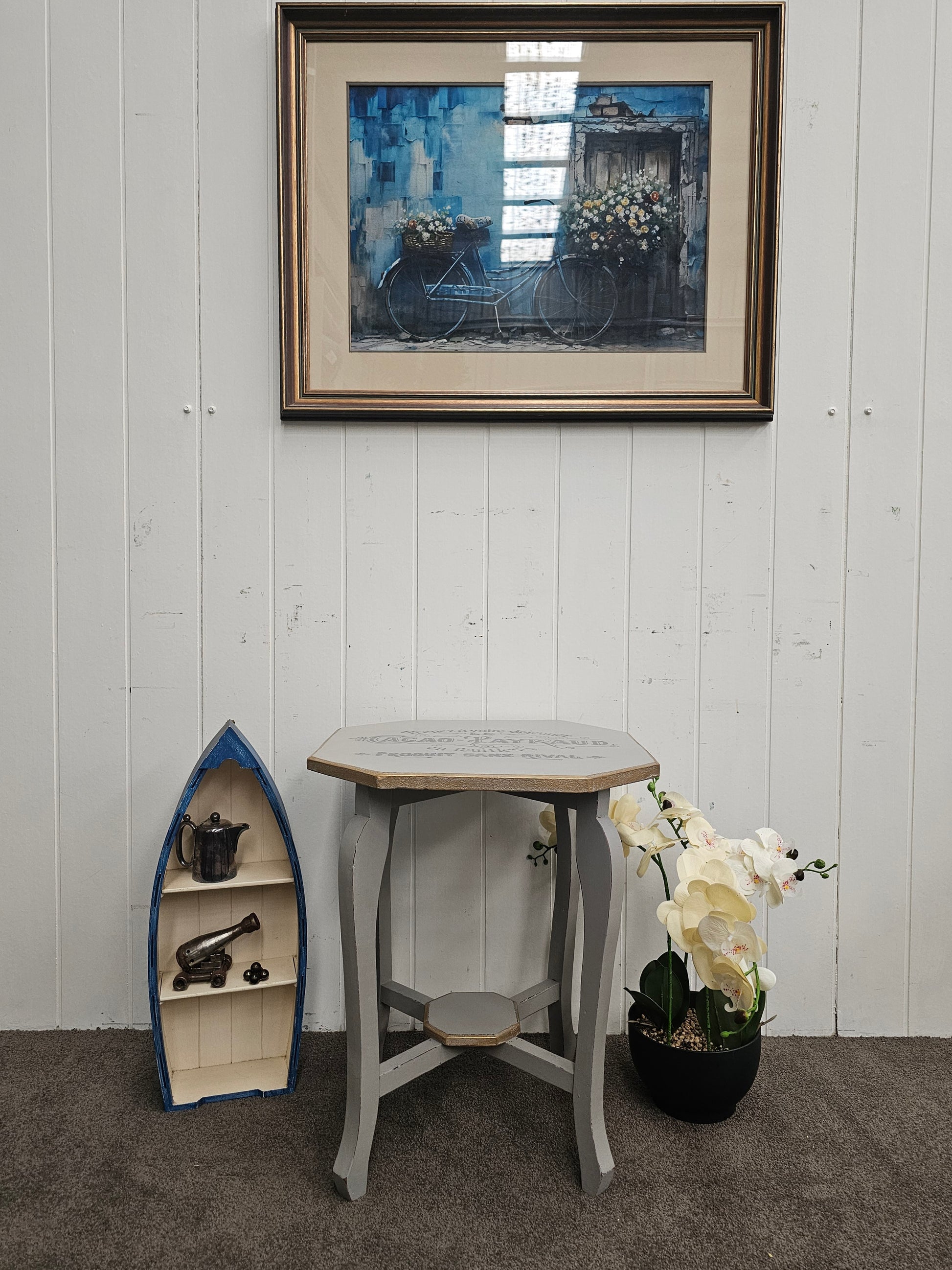 A whisper of Parisian mornings, where sun spills across café tables and the scent of cocoa lingers in the air — Café Catalyst brings vintage charm and continental flair in a compact and characterful form. Finished in soft greys with worn edges and hand-stenciled French typography, this octagonal beauty is petite, proud, and full of personality.
