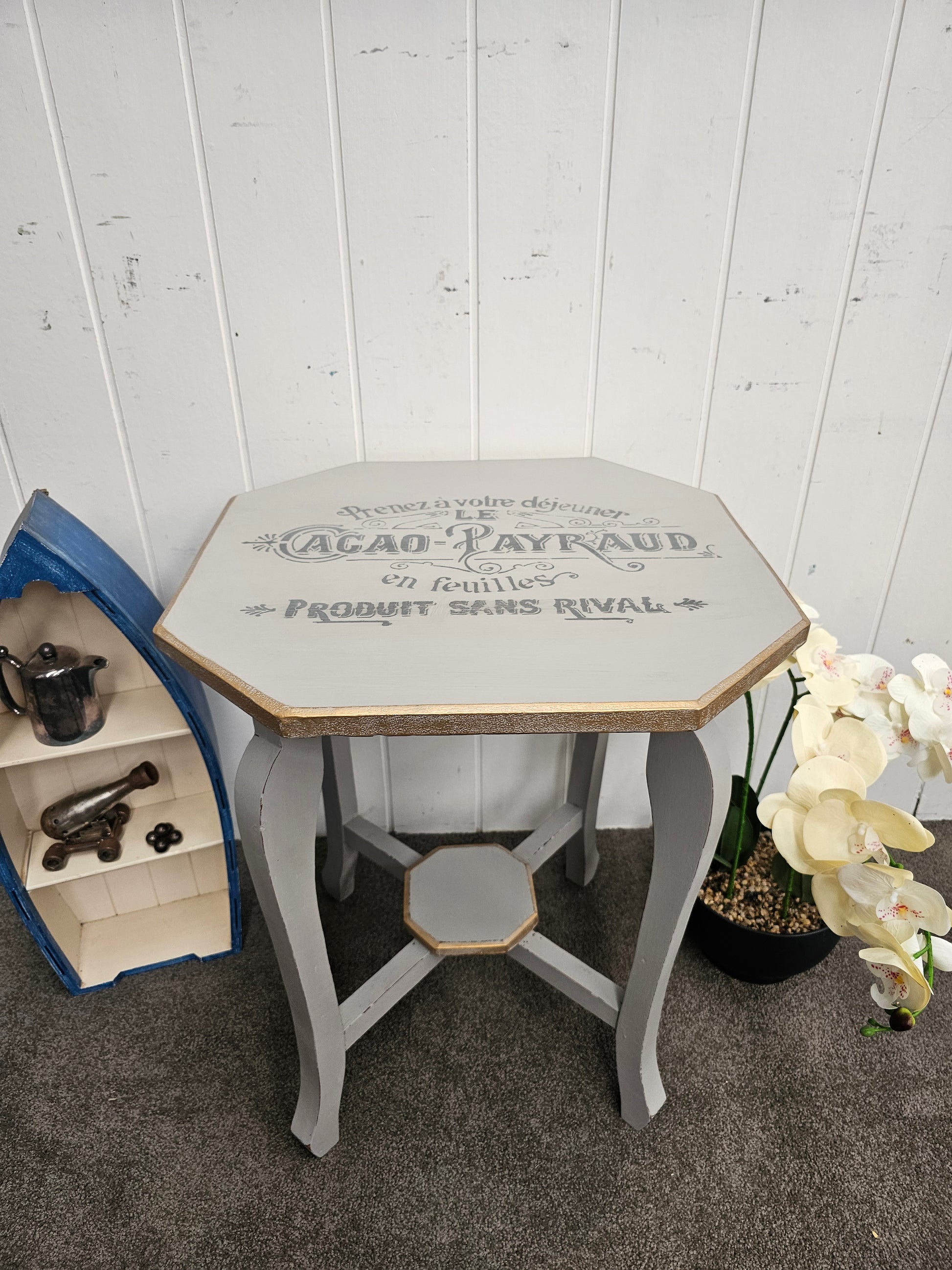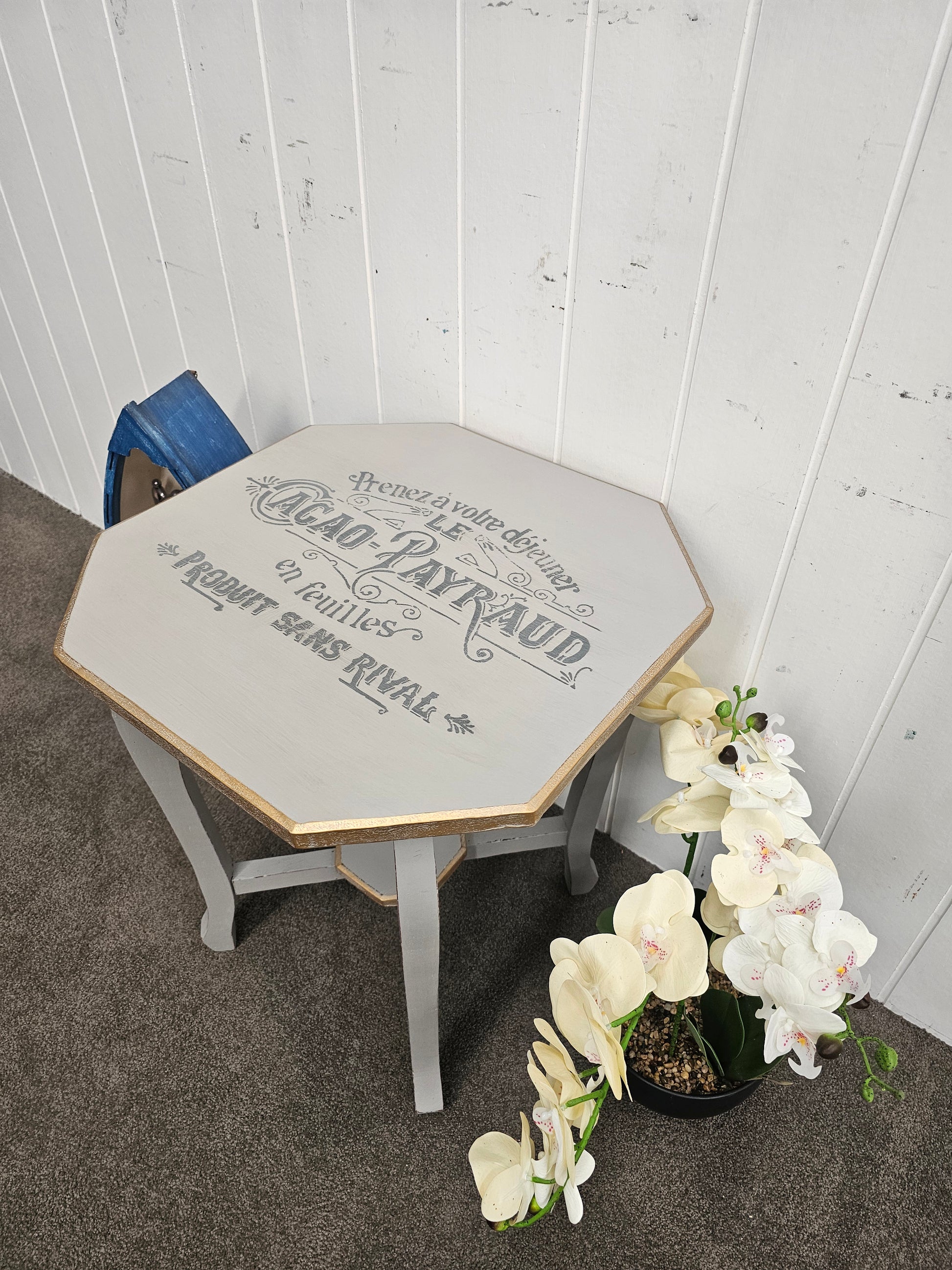 – Octagonal tabletop with vintage French ‘Cacao Payraud’ typography