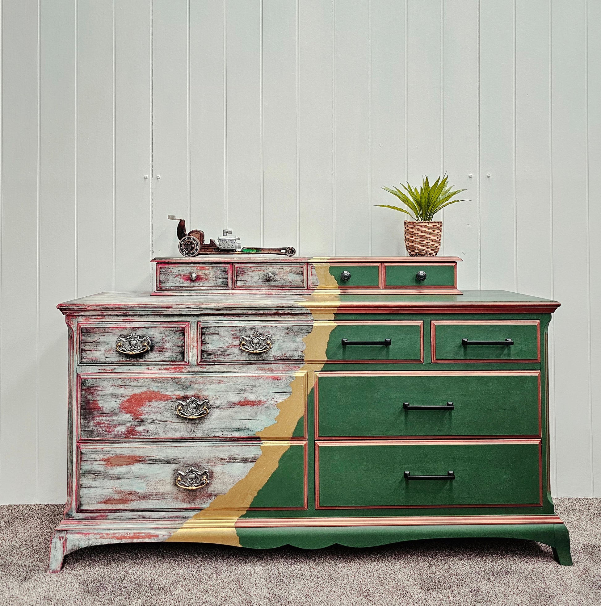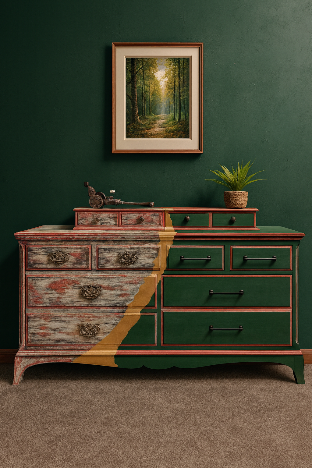 🔹 Finish: Split-tone design with distressed antique patina & rich green lacquer