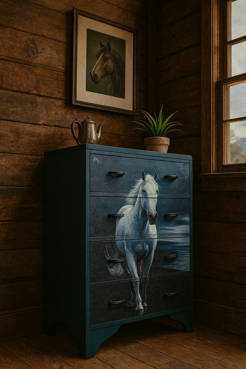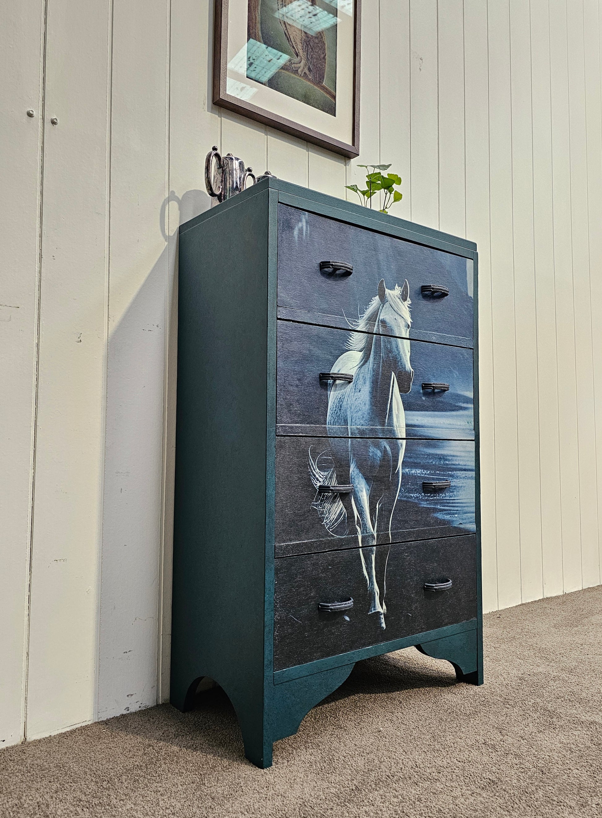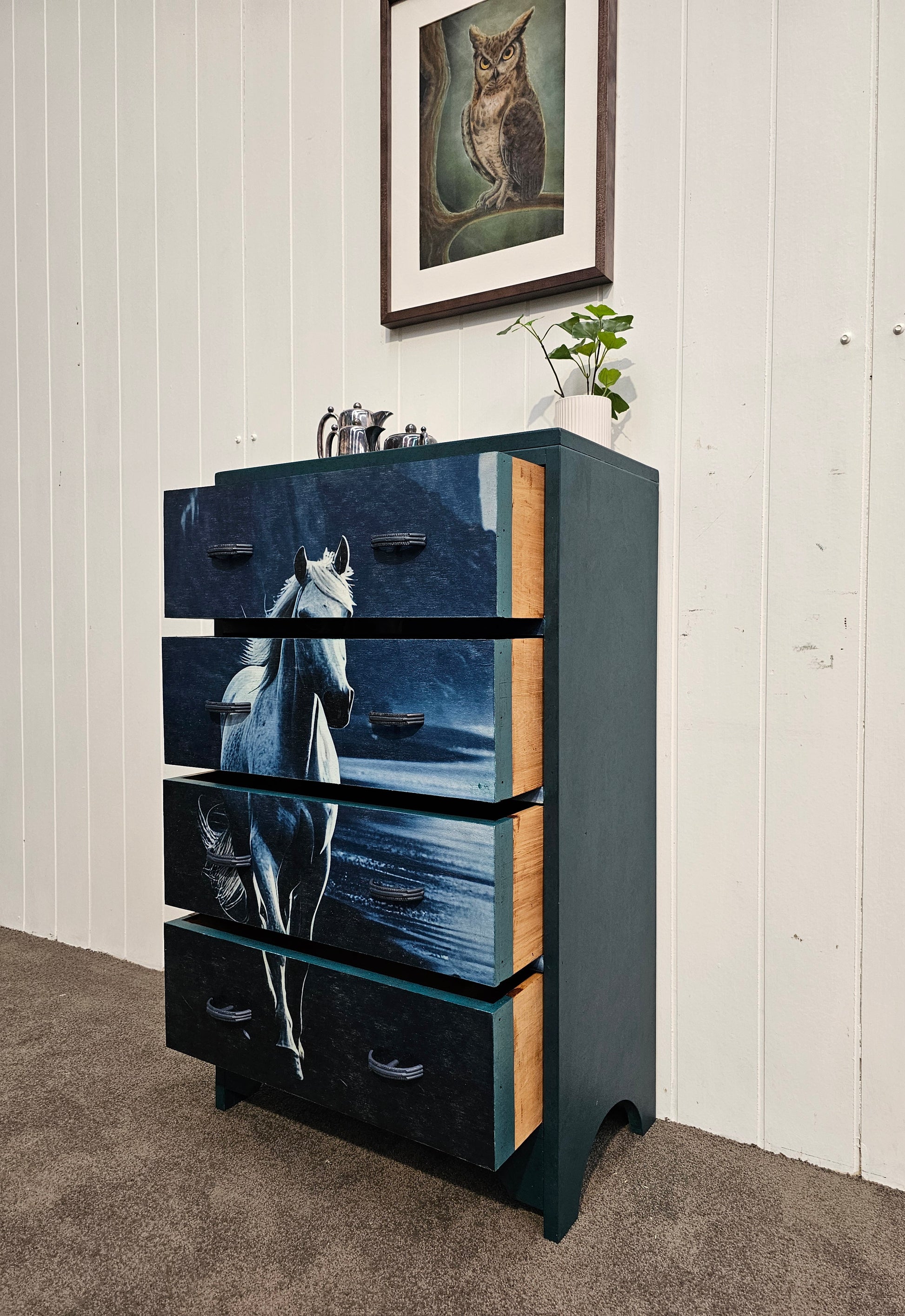Painted in the hush of twilight blues, this tall chest of drawers carries the soul of a galloping dream. Late Night Canter captures a white horse in motion — mane sweeping, hooves gliding over moonlit sands — as if caught between worlds. The dark teal body deepens the drama, letting the image breathe like a breeze across the plains.