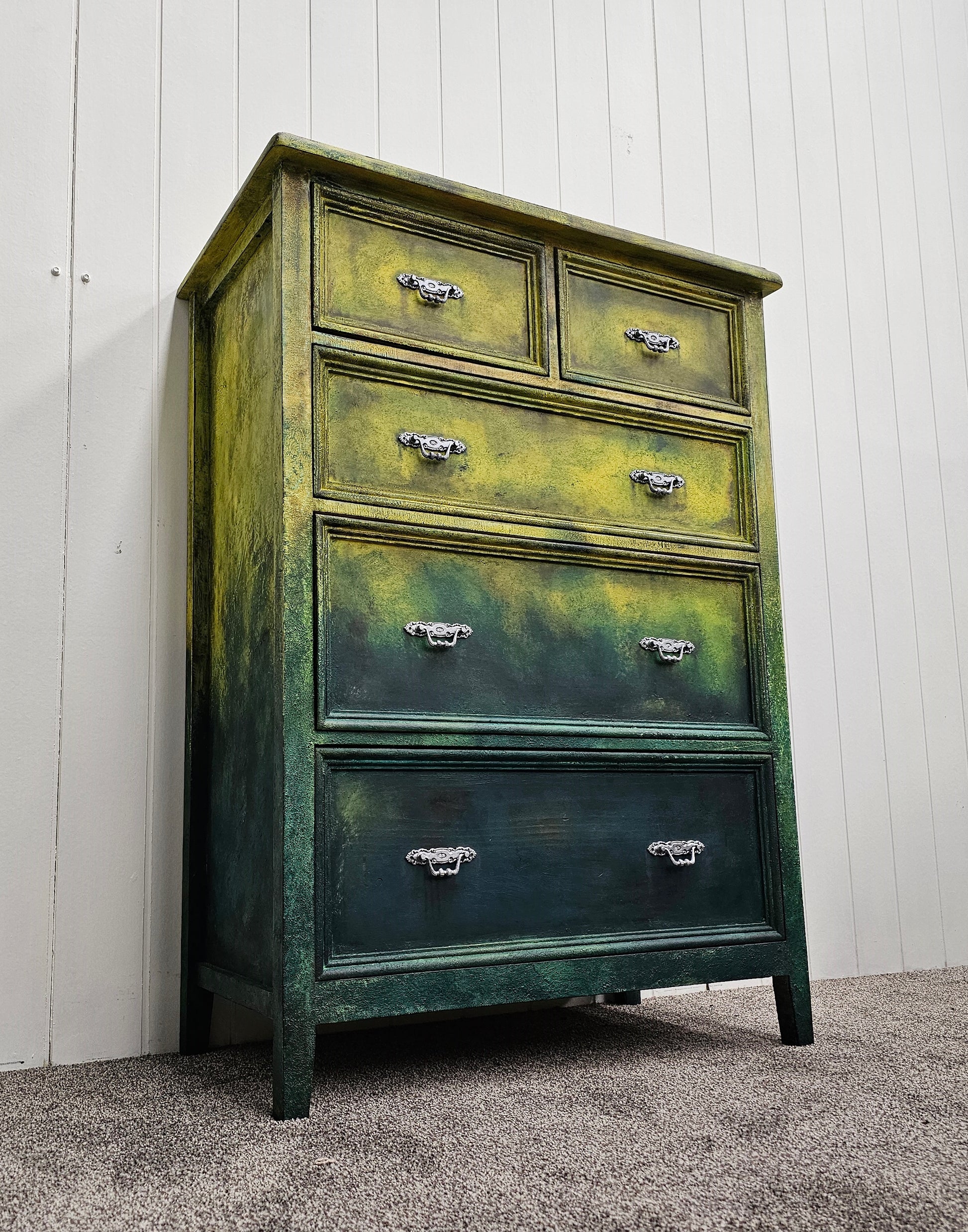 Moss Alchemy feels born of transformation — where rich green understory meets golden canopy, and something ancient stirs beneath the surface. Its drawers shimmer with tonal magic, shifting from lichen yellow to emerald and deep indigo, like layers of moss, shadow, and time. Silvery handles offer a quiet contrast, like dew catching moonlight on a fern’s edge.