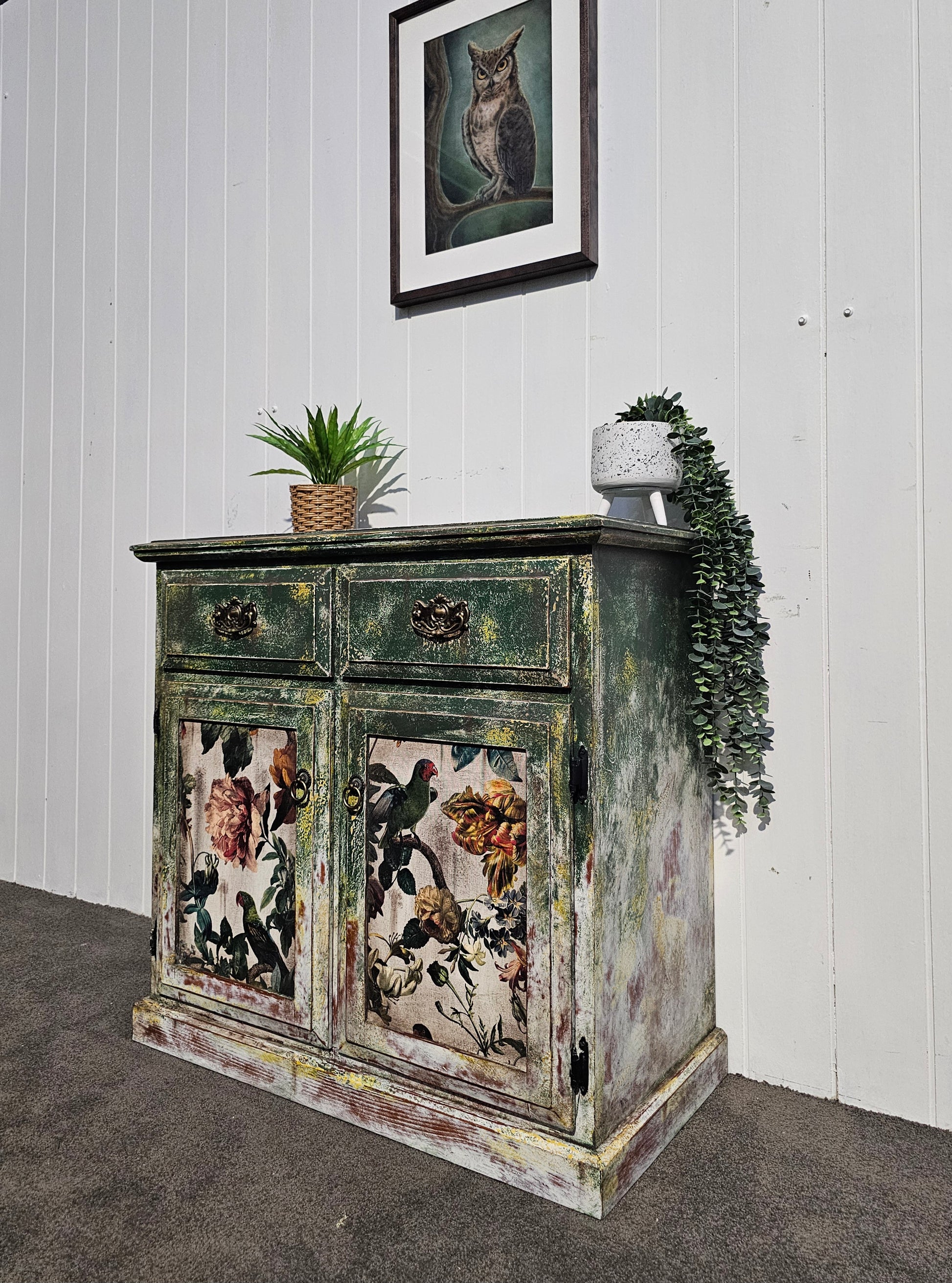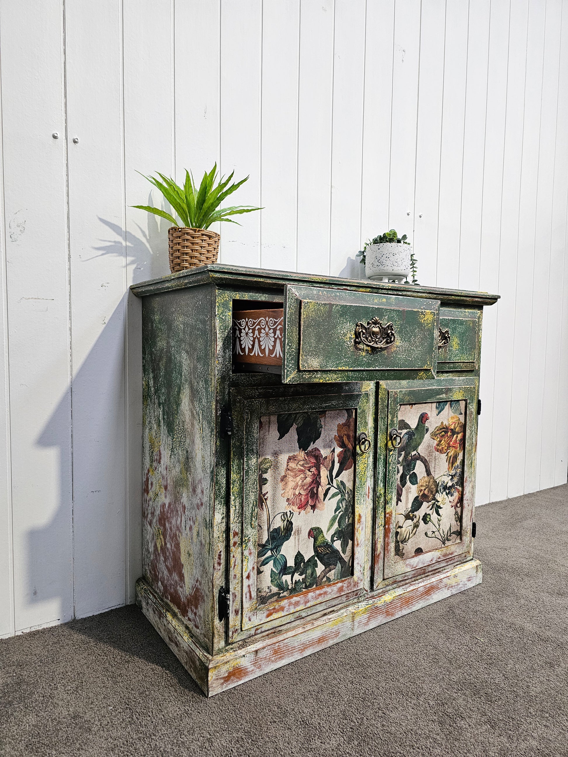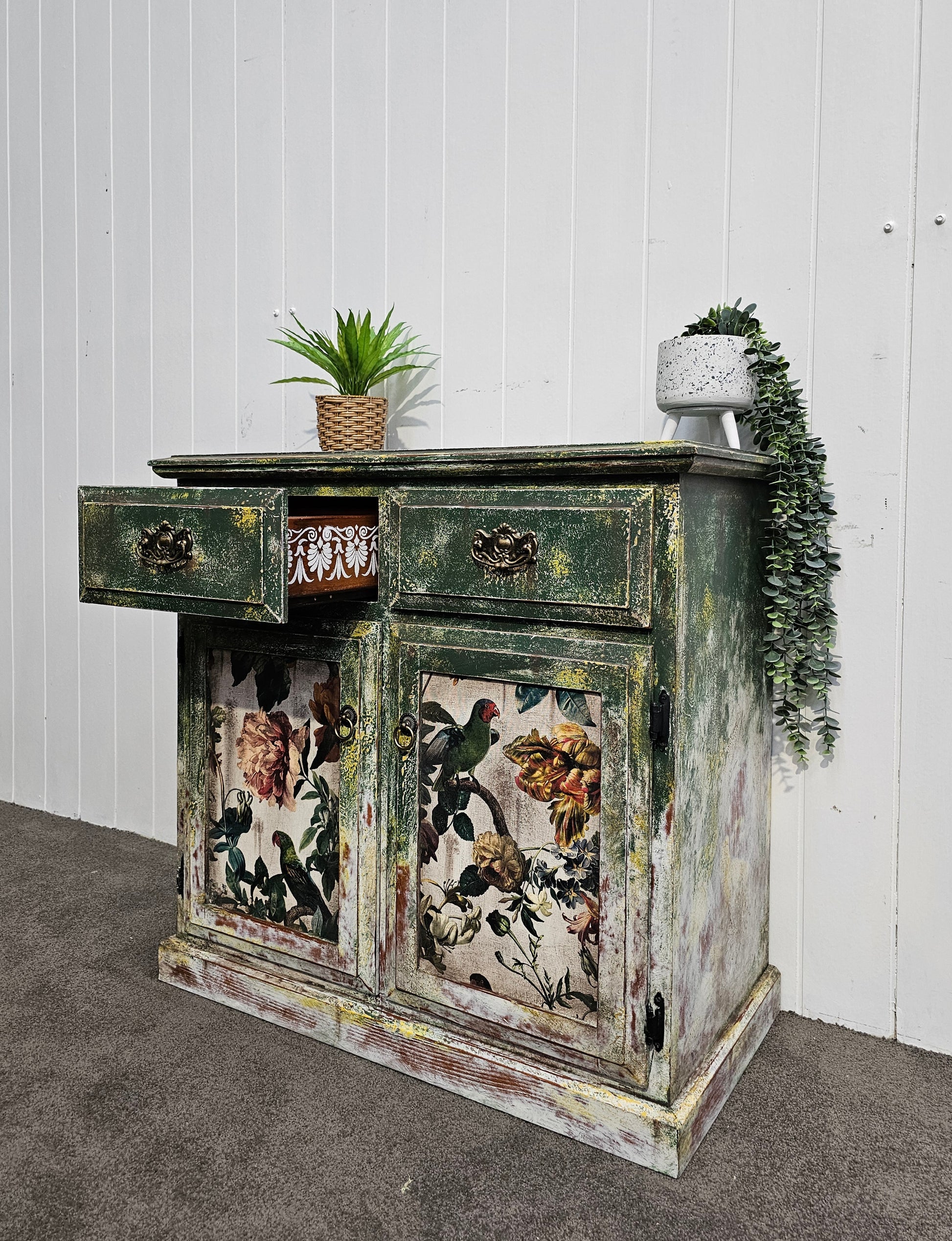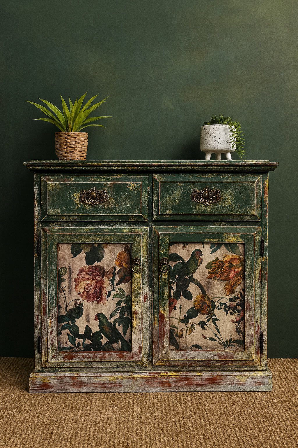 Let your imagination bloom with Verdant Folly, a lush and whimsical sideboard that feels like it was plucked from a secret garden. Deep mossy greens meet aged patina, while each door panel bursts with florals and curious parrots, creating an area that’s both romantic and wild.