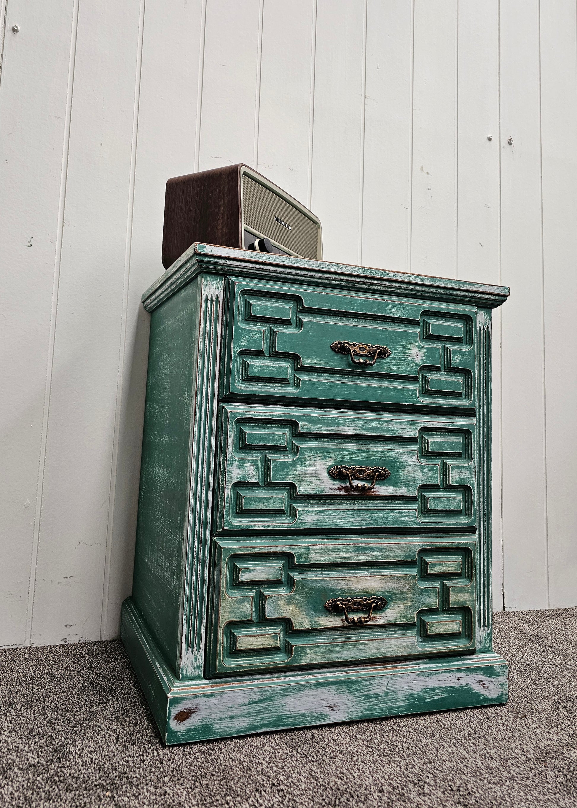 🔹 Finish: Distressed jade green with antique white fading and weathered edges