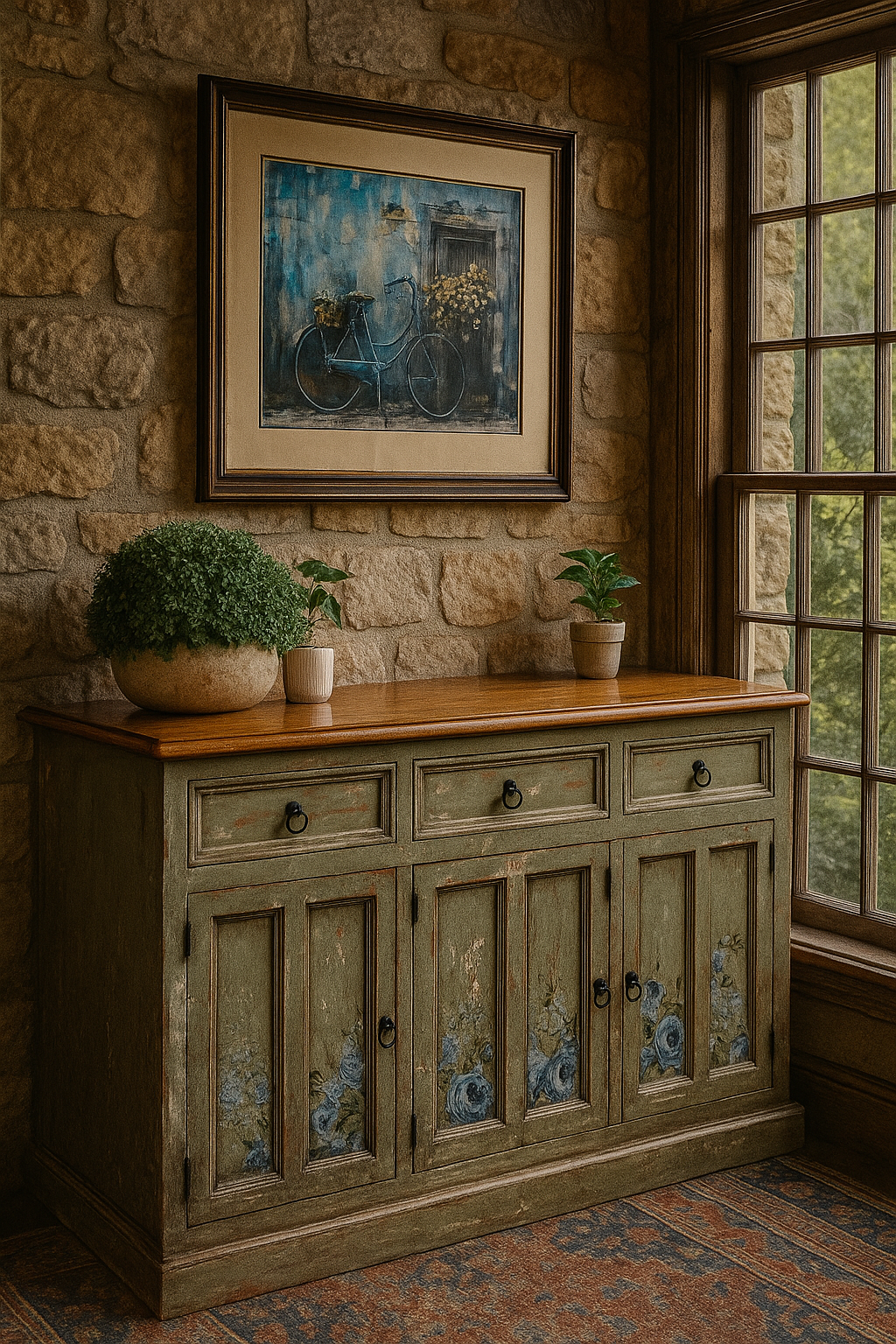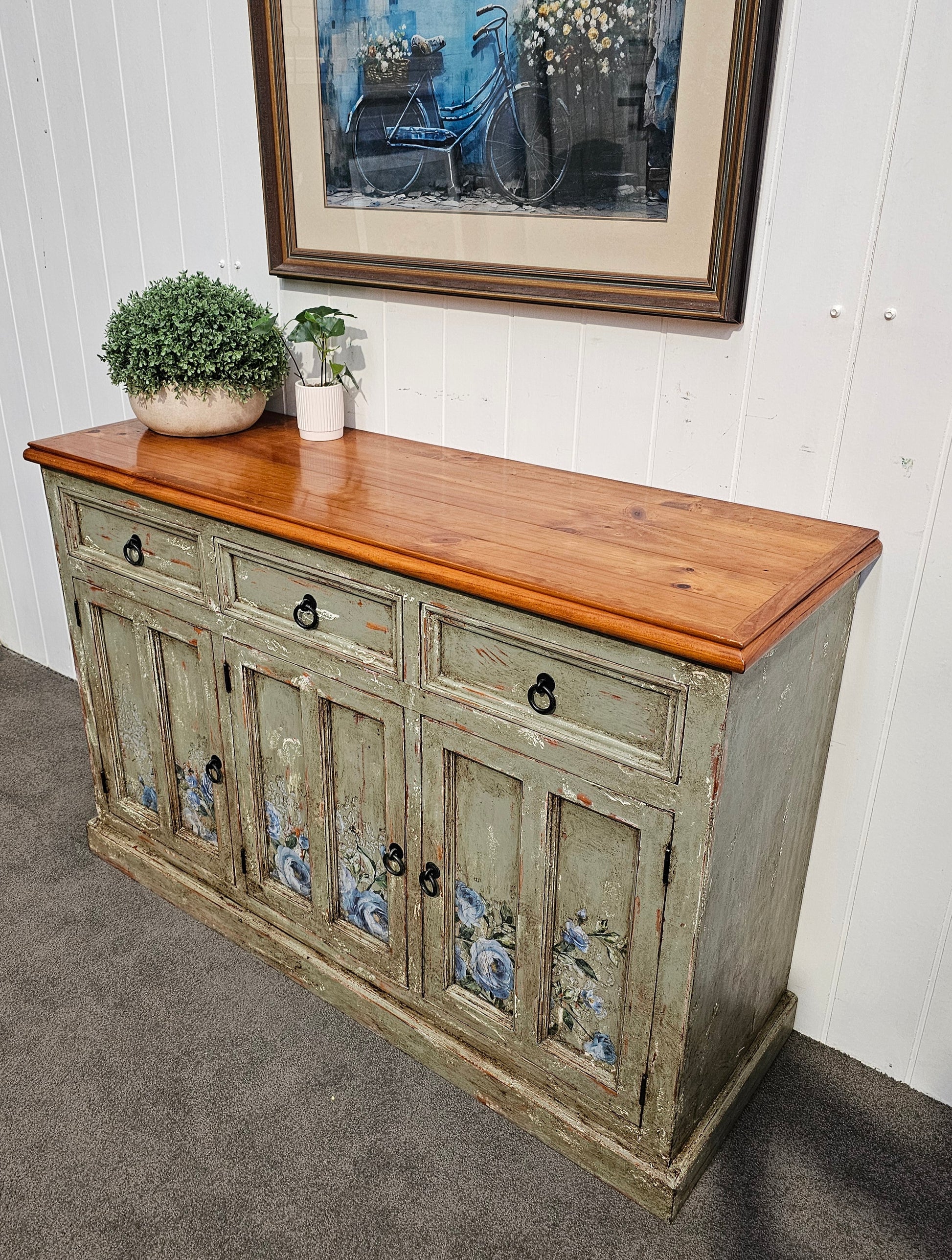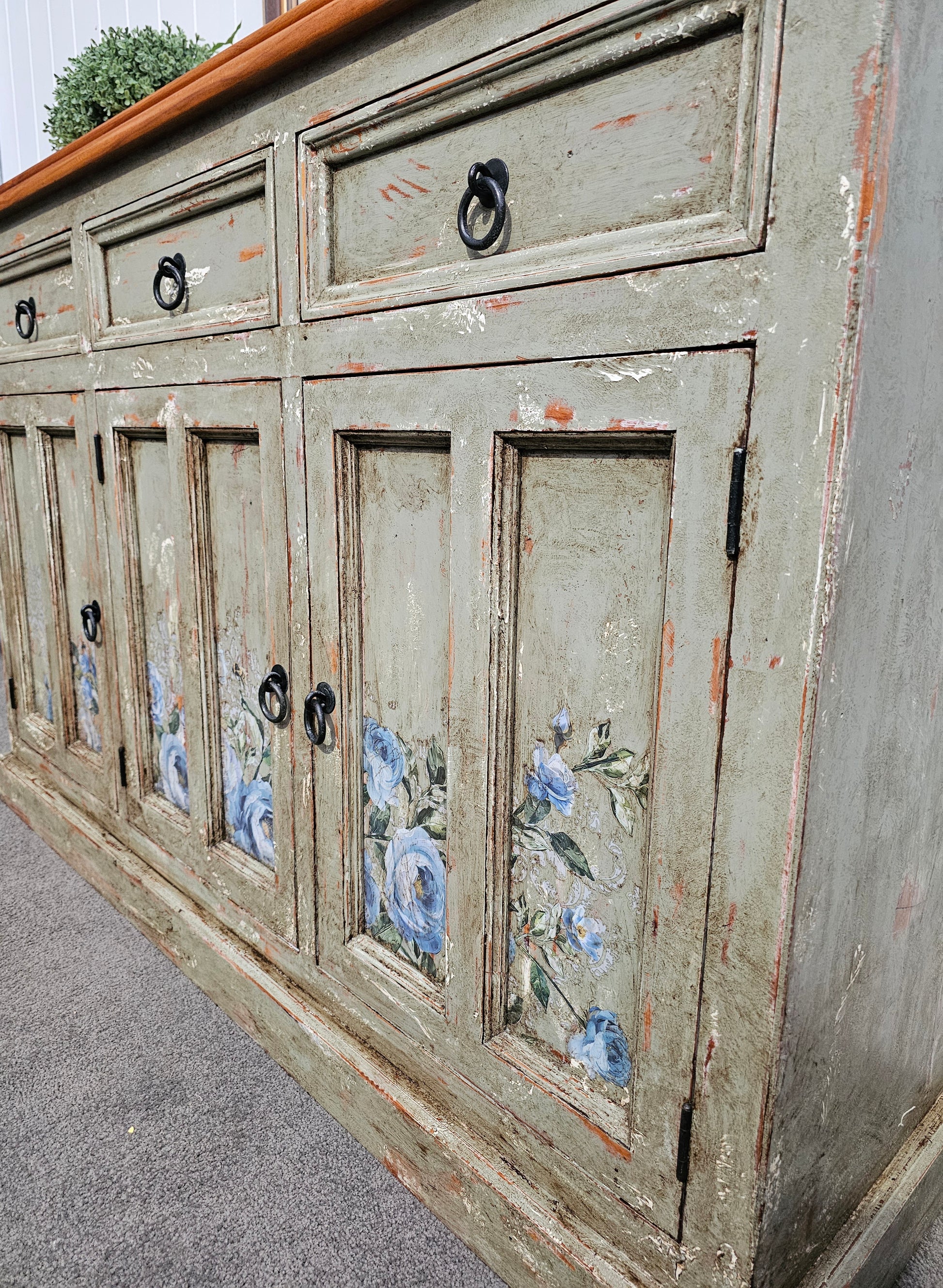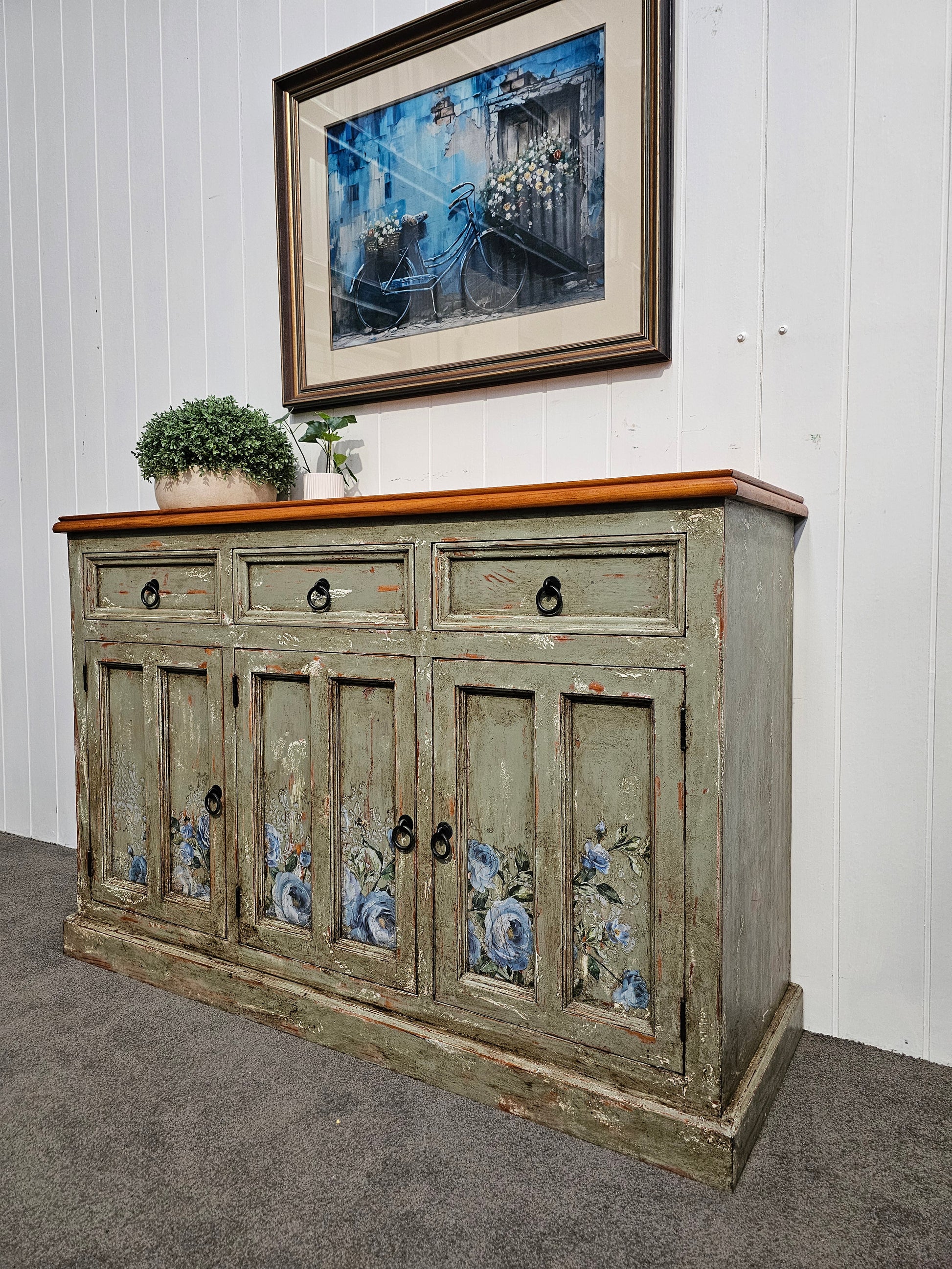 Expertly crafted from solid wood, this beautifully weathered piece features a distressed sage green finish that brings character and warmth to any space. The highlight of this sideboard is its floral detailing on the lower cabinet doors—delicate blue blooms that add a soft, artistic touch to its antique look.